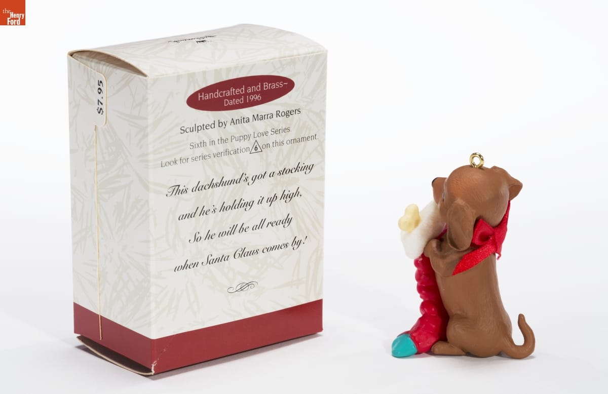 Handcrafted and Brass - / Dated 1996 / Sculpted by Anita Marra Rogers / Sixth in the Puppy Love Series / Look for series verification 6 on this ornament. / This dachshund's got a stocking / and he's holding it up high, / So he will be all ready / when Santa Claus comes by!