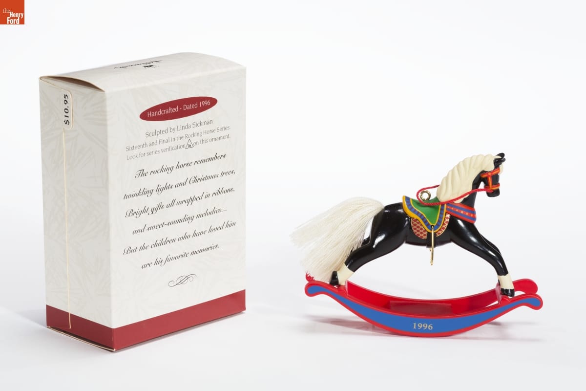 Handcrafted - Dated 1996 / Sculpted by Linda Sickman / Sixteenth and Final in the Rocking Horse Series / Look for series verification 16 on this ornament. / The rocking horse remembers / twinkling lights and Christmas trees, / Bright gifts all wrapped in ribbons, / and sweet-sounding melodies... / But the children who have loved him / are his favorite memories.