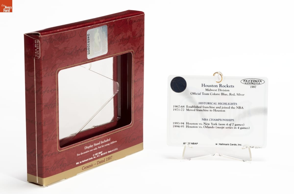 KEEPSAKE / ORNAMENT / 1997 / Houston Rockets / Midwest Division / Official Team Colors: Blue, Red, Silver / HISTORICAL HIGHLIGHTS / 1967-68 Established franchise and joined the NBA / 1971-72 Move franchise to Houston / NBA CHAMPIONSHIPS / 1993-94 Houston vs. New York (won 4 of 7 games) / 1994-95 Houston vs. Orlando (swept series in 4 games) / (C) 1997 NBAP Hallmark Cards, Inc.