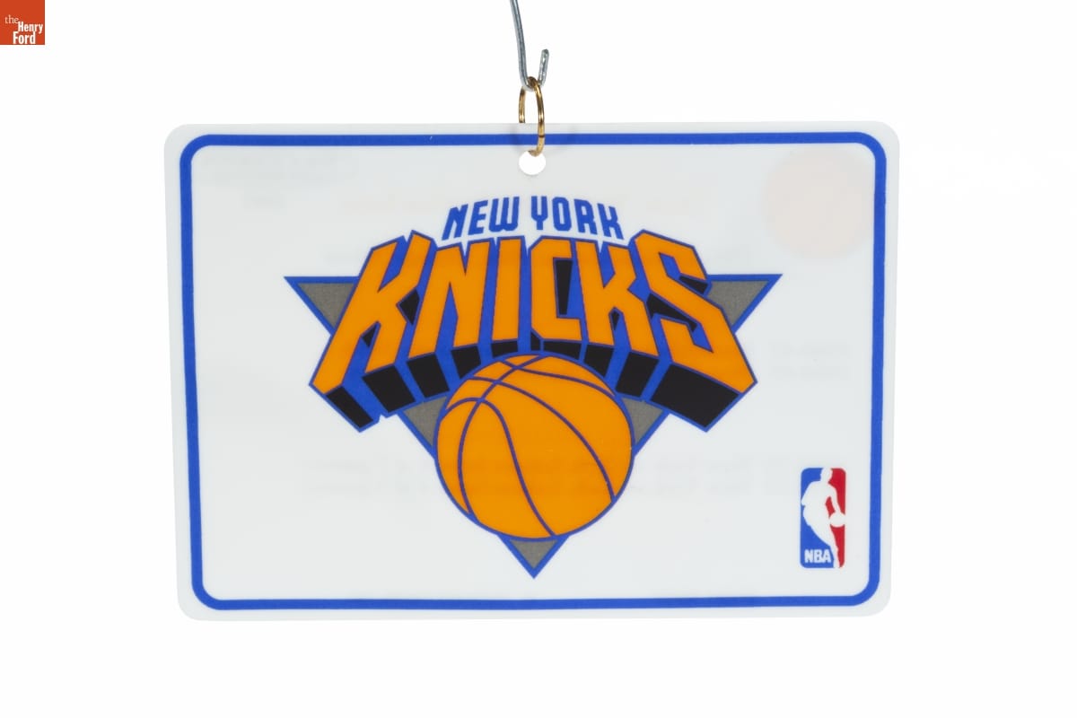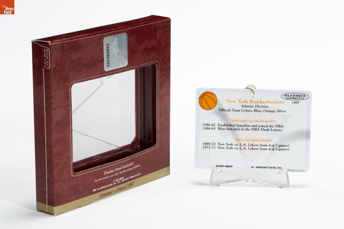 KEEPSAKE / ORNAMENT / 1997 / New York Knickerbockers / Atlantic Division / Official Team Colors: Blue, Orange, Silver / HISTORICAL HIGHLIGHTS / 1946-47 Established franchise and joined the NBA / 1984-85 Won first pick in the NBA Draft Lottery / NBA CHAMPIONSHIPS / 1969-70 New York vs. L.A. Lakers (won 4 of 7 games) / 1972-73 New York vs. L.A. Lakers (won 4 of 5 games) / (C) 1997 NBAP Hallmark Cards, Inc.