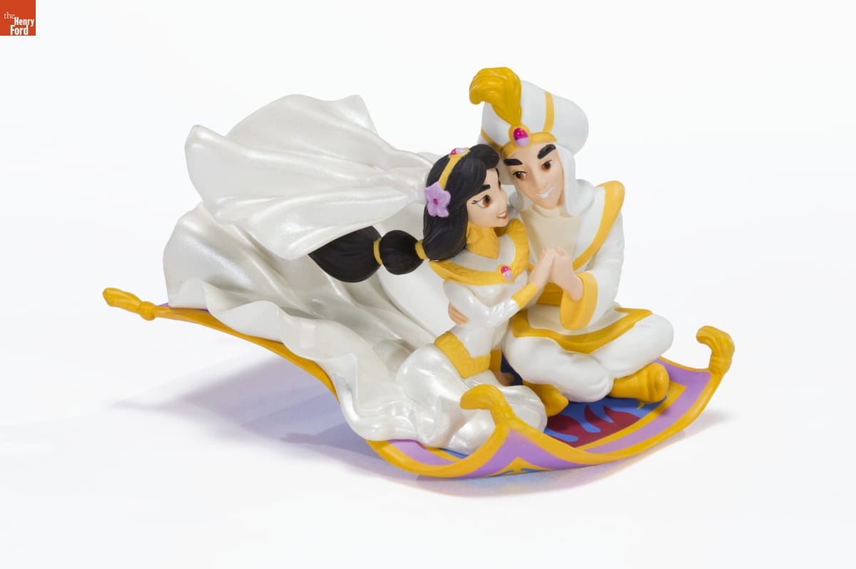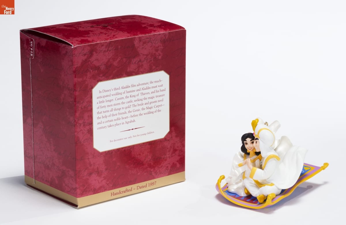 In Disney's third Aladdin film adventure, the much- / anticipated wedding of Jasmine and Aladdin must wait / a little longer. Cassim, the King of Thieves, and his band / of forty men storm the castle, seeking the magic treasure / that turns all things to gold! The bride and groom need / the help of their friends, the Genie, the Magic Carpet-- / and a certain noble heart--before the wedding of the / century takes place in Agrabah. / For decorative use only. Not for young children. / Handcrafted - Dated 1997