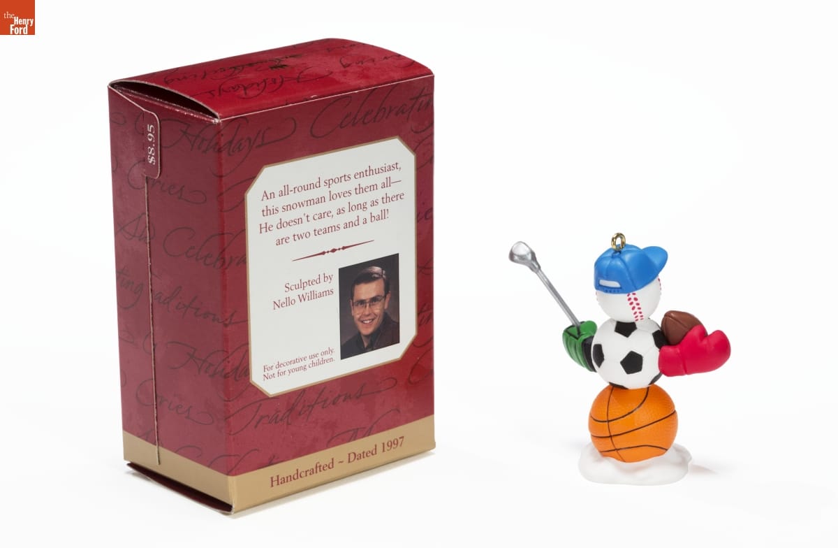 An all-round sports enthusiast, this snowman loves them all-- / He doesn't care, as long as there are two teams and a ball! / Sculpted by / Nello Williams / For decorative use only. / Not for young children. / Handcrafted - Dated 1997