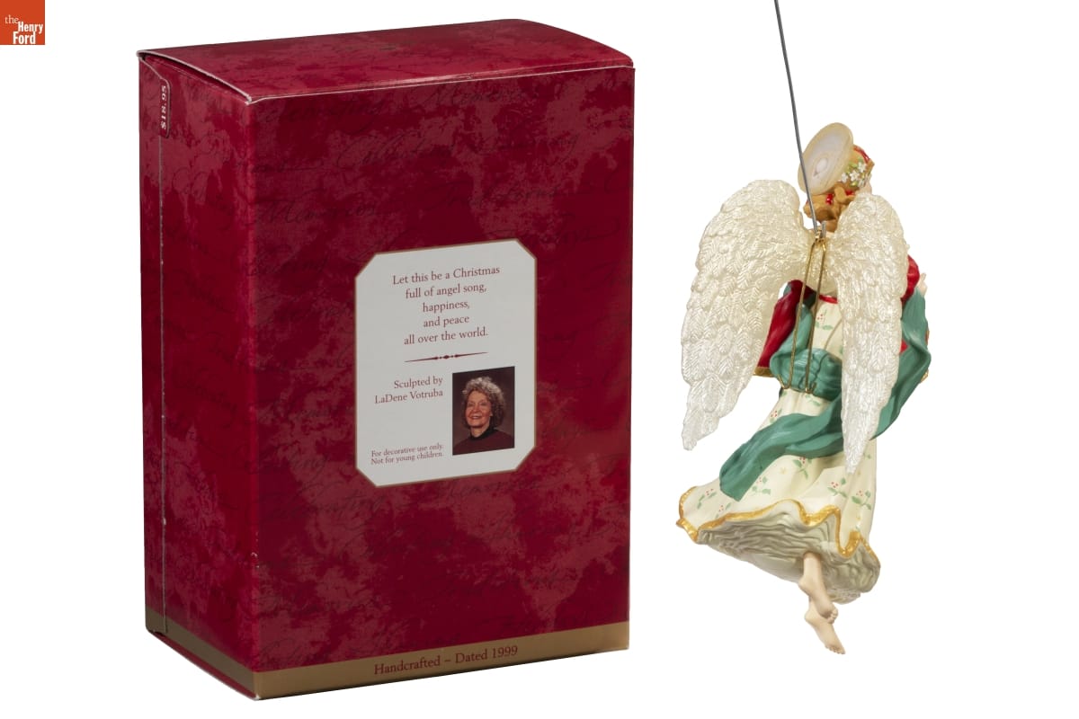 Let this be a Christmas / full of angel song, / happiness, / and peace / all over the world. / Sculpted by / LaDene Votruba / For decorative use only. / Not for young children. / Handcrafted - Dated 1999