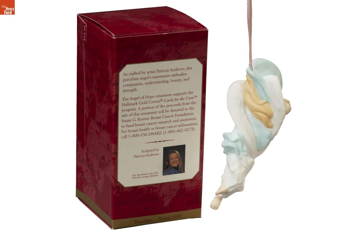 As crafted by artist Patricia Andrews, this / porcelain angel's expression embodies / compassion, understanding, beauty, and / strength. / The Angel of Hop ornament supports the / Hallmark Gold Crown Cards for the Cure / program. A portion of the proceeds from the / sale of this ornament will be donated to the / Susan G. Komen Breast Cancer Foundation / to fund breast cancer research and awareness. / For breast health or breast cancer information, / call 1-800-I'm AWARE (1-800-462-9273). / Sculpted by / Patricia Andrews / For decorative use only. / Not for young children. / Porcelain - Dated 1999
