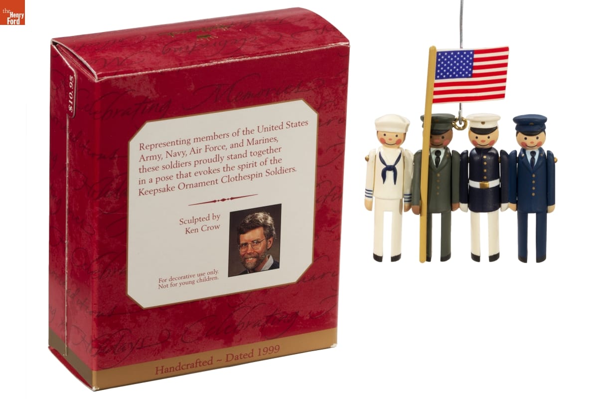 Representing members of the United States / Army, Navy, Air Force, and Marines, / these soldiers proudly stand together / in a pose that evokes the spirit of the Keepsake Ornament Clothespin Soldiers. / Sculpted by / Ken Crow / For decorative use only. / Not for young children. / Handcrafted - Dated 1999