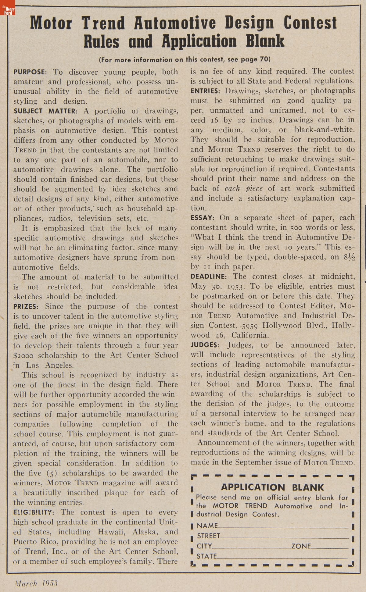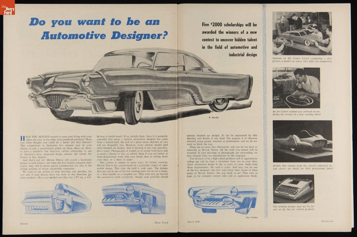 In 1953, Motor Trend magazine sponsored a contest for readers interested in careers in automotive design. Entrants submitted drawings, sketches, and photos showing their design proposals, along with essays predicting automotive design trends over the next ten years. Five winners each received a $2,000 scholarship to the prestigious Art Center School in Los Angeles.
