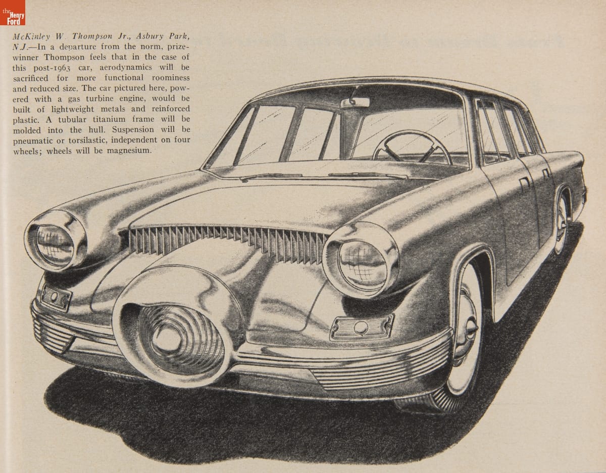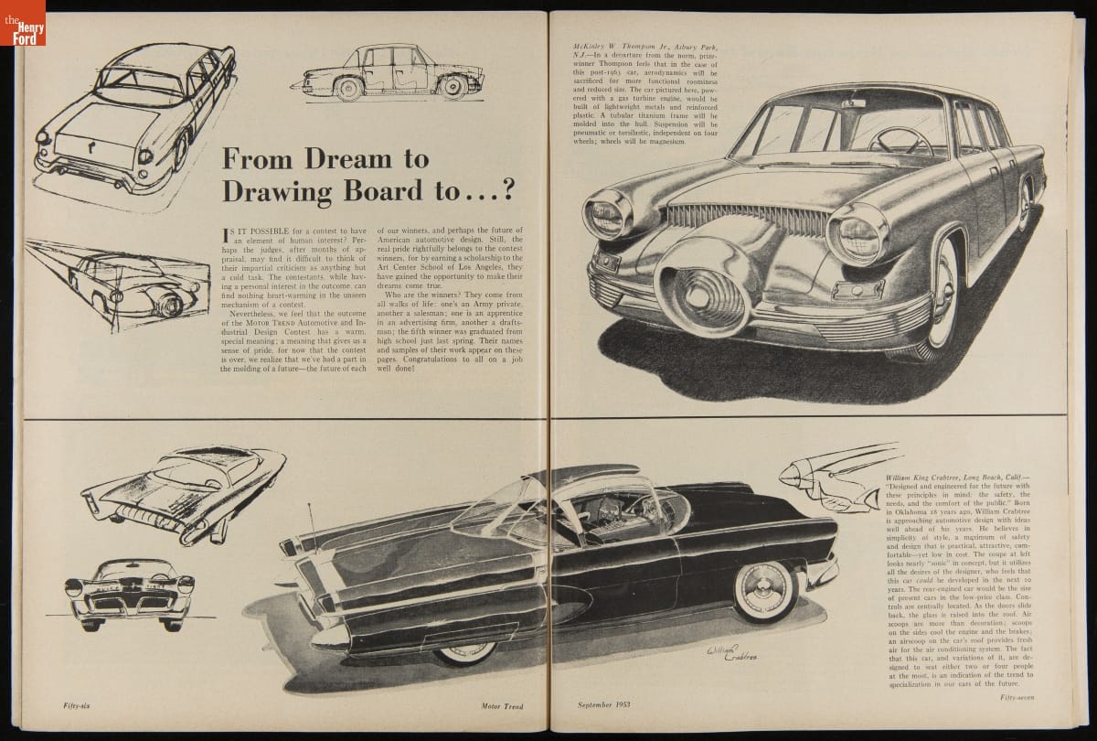 In 1953, Motor Trend magazine sponsored a contest for readers interested in careers in automotive design. Entrants submitted drawings, sketches, and photos showing their design proposals, along with essays predicting automotive design trends over the next ten years. Five winners each received a $2,000 scholarship to the prestigious Art Center School in Los Angeles.