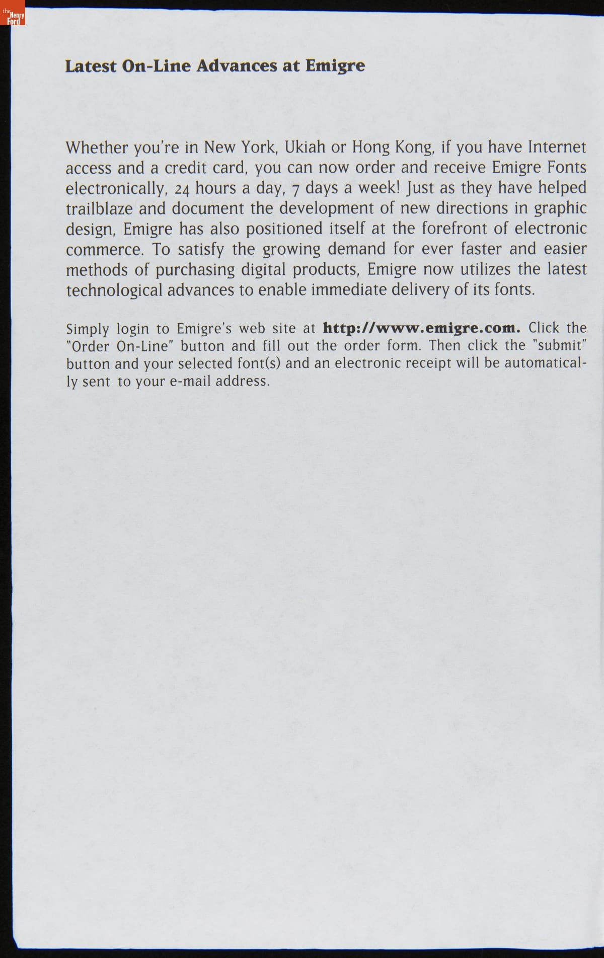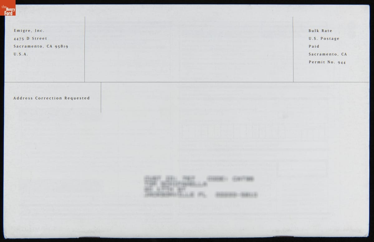 Emigre is a digital type foundry established by Rudy VanderLans and Zuzana Licko. The company's history is linked with the introduction of the 1984 Macintosh computer, used to design their early bitmapped typefaces. Emigre's digital work gained notoriety -- defying visual communication standards with fractured, layered combinations of text and image. This item advertised fonts or other items available for purchase.