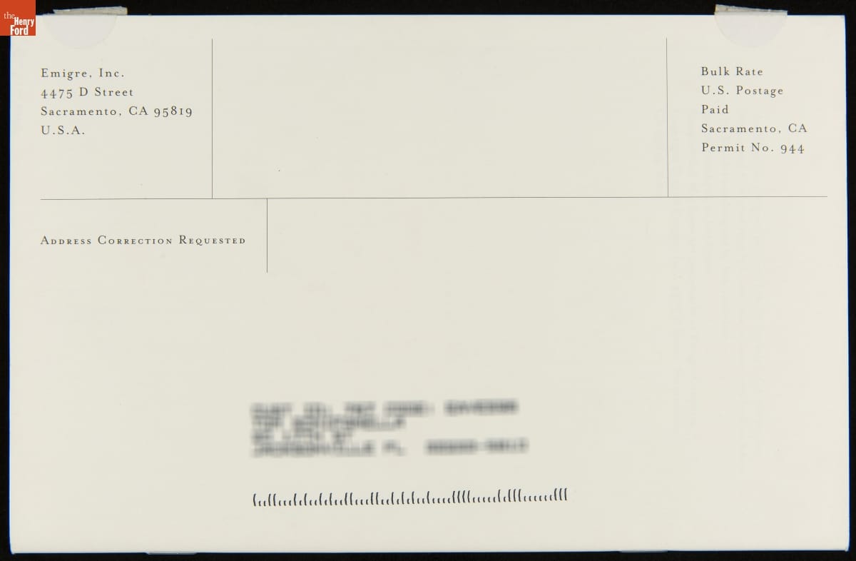 Emigre is a digital type foundry established by Rudy VanderLans and Zuzana Licko. The company's history is linked with the introduction of the 1984 Macintosh computer, used to design their early bitmapped typefaces. Emigre's digital work gained notoriety -- defying visual communication standards with fractured, layered combinations of text and image. This item advertised fonts or other items available for purchase.