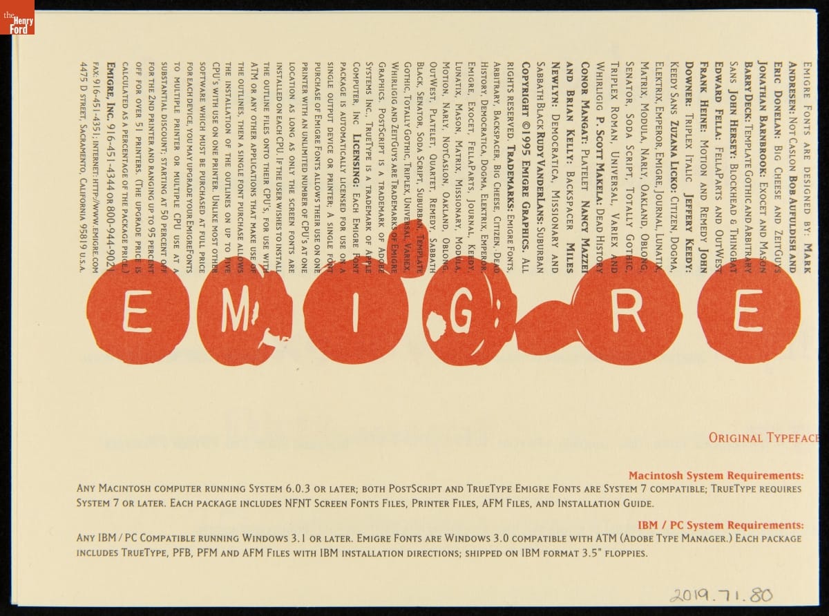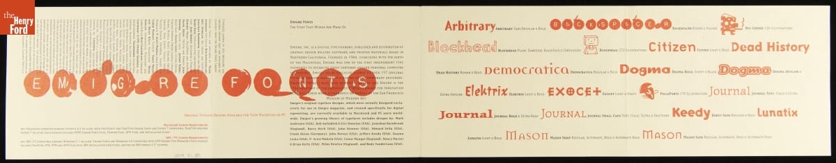 Emigre is a digital type foundry established by Rudy VanderLans and Zuzana Licko. The company's history is linked with the introduction of the 1984 Macintosh computer, used to design their early bitmapped typefaces. Emigre's digital work gained notoriety -- defying visual communication standards with fractured, layered combinations of text and image. This item advertised fonts or other items available for purchase.