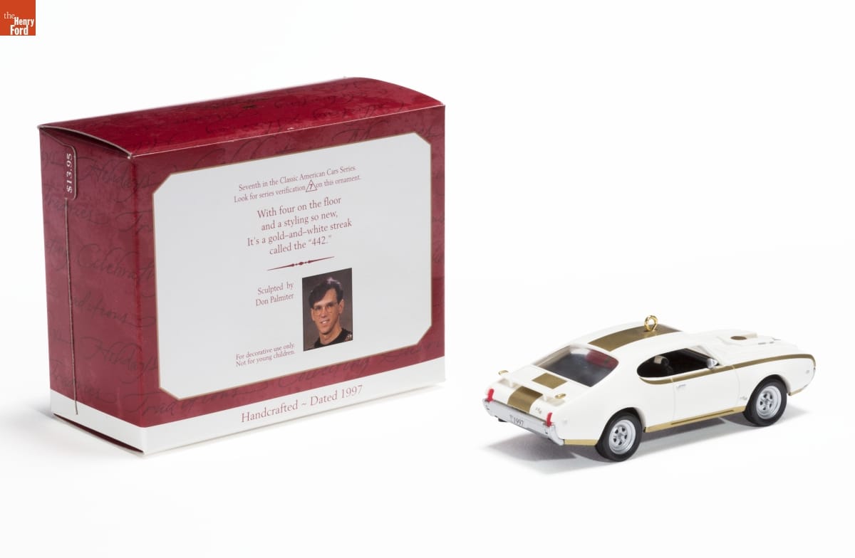 Seventh in the Classic American Cars Series. / Look for series verification 7 on this ornament. / With four on the floor / and a styling so new, / It's a gold-and-white streak / called the "442." / Sculpted by / Don Palmiter / For decorative use only. / Not for young children. / Handcrafted - Dated 1997
