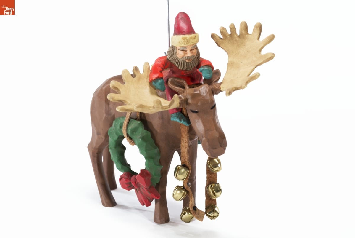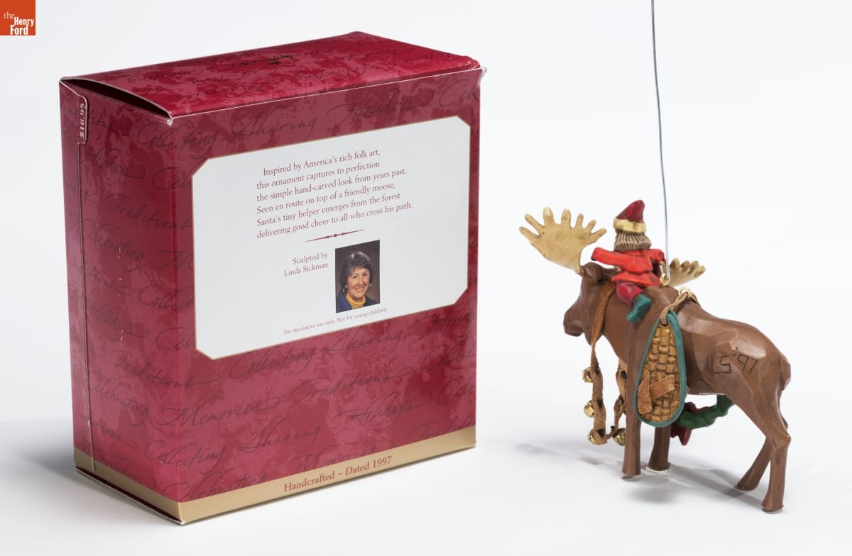 Inspired by America's rich folk art, / this ornament captures to perfection / the simple hand-carved look from years past. / Seen en route on top of a friendly moose, / Santa's tiny helper emerges from the forest / delivering good cheer to all who cross his path. / Sculpted by / Linda Sickman / For decorative use only. Not for young children. / Handcrafted - Dated 1997