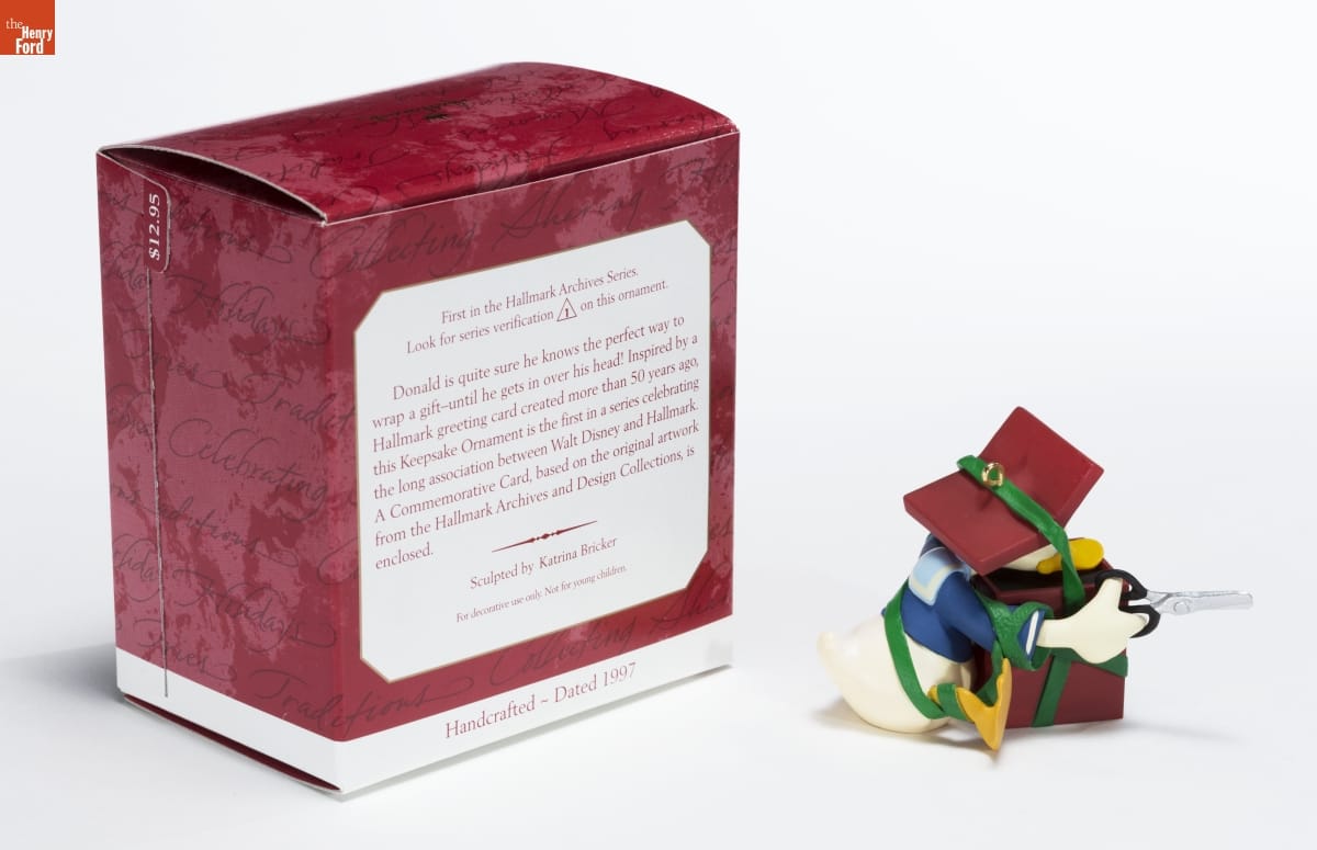 First in the Hallmark Archives Series. / Look for series verification 1 on this ornament. / Donald is quite sure he knows the perfect way to / wrap a gift-until he gets in over his head! Inspired by a / Hallmark greeting card created more than 50 years ago, / this Keepsake Ornament is the first in a series celebrating / the long association between Walt Disney and Hallmark. / A Commemorative Card, based on the original artwork / from the Hallmark Archives and Design Collctions, is / enclosed. / Sculpted by Katrina Bricker / For decorative use only. Not for young children. / Handcrafted - Dated 1997