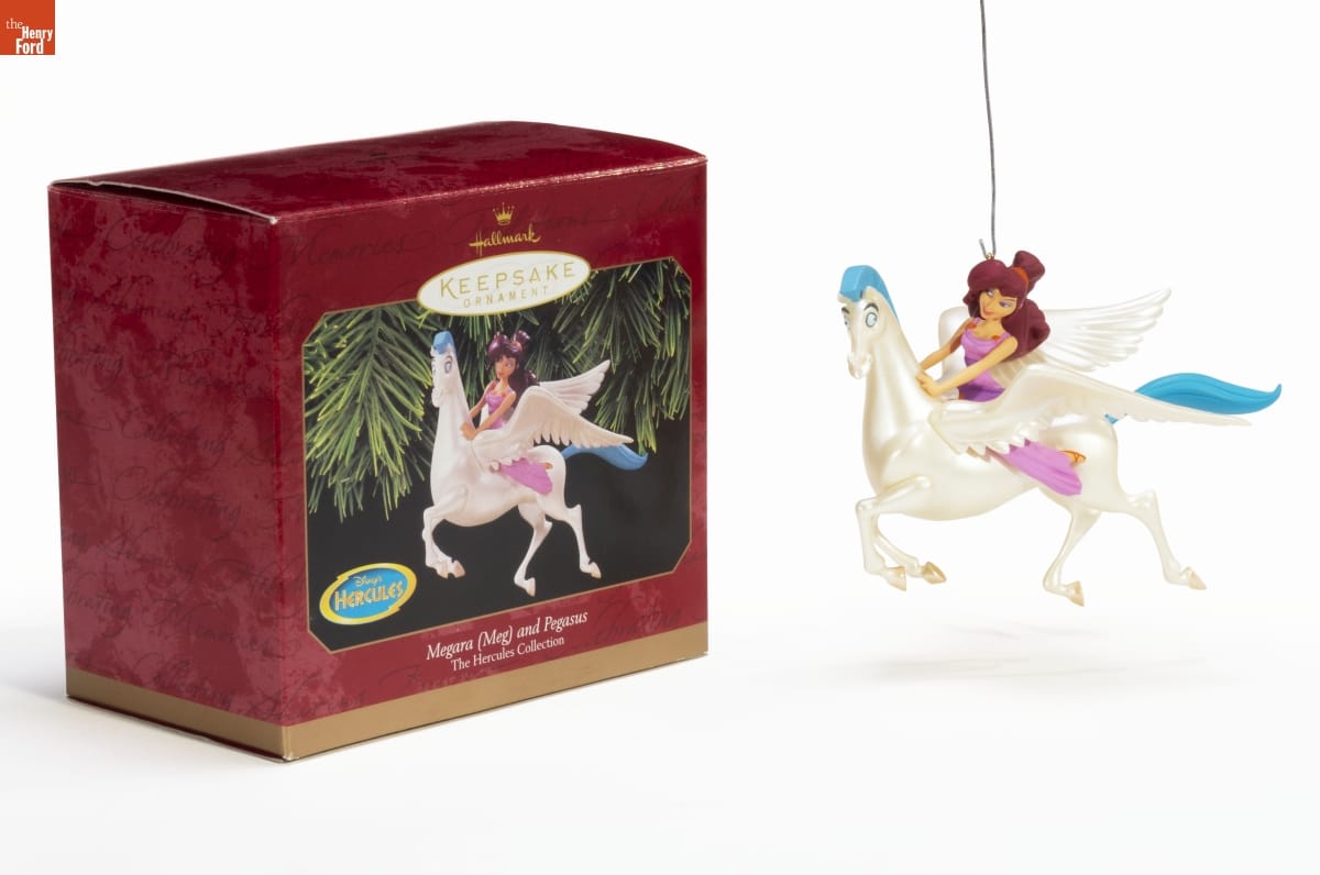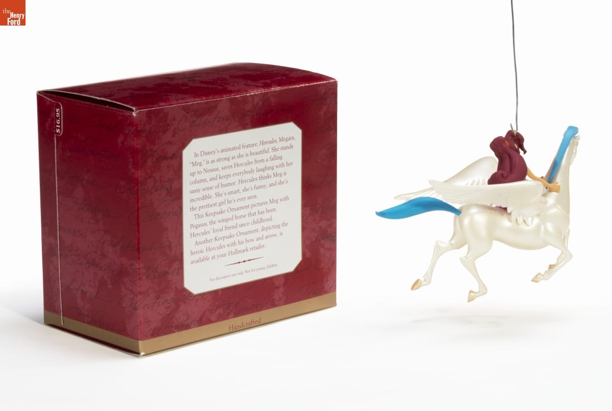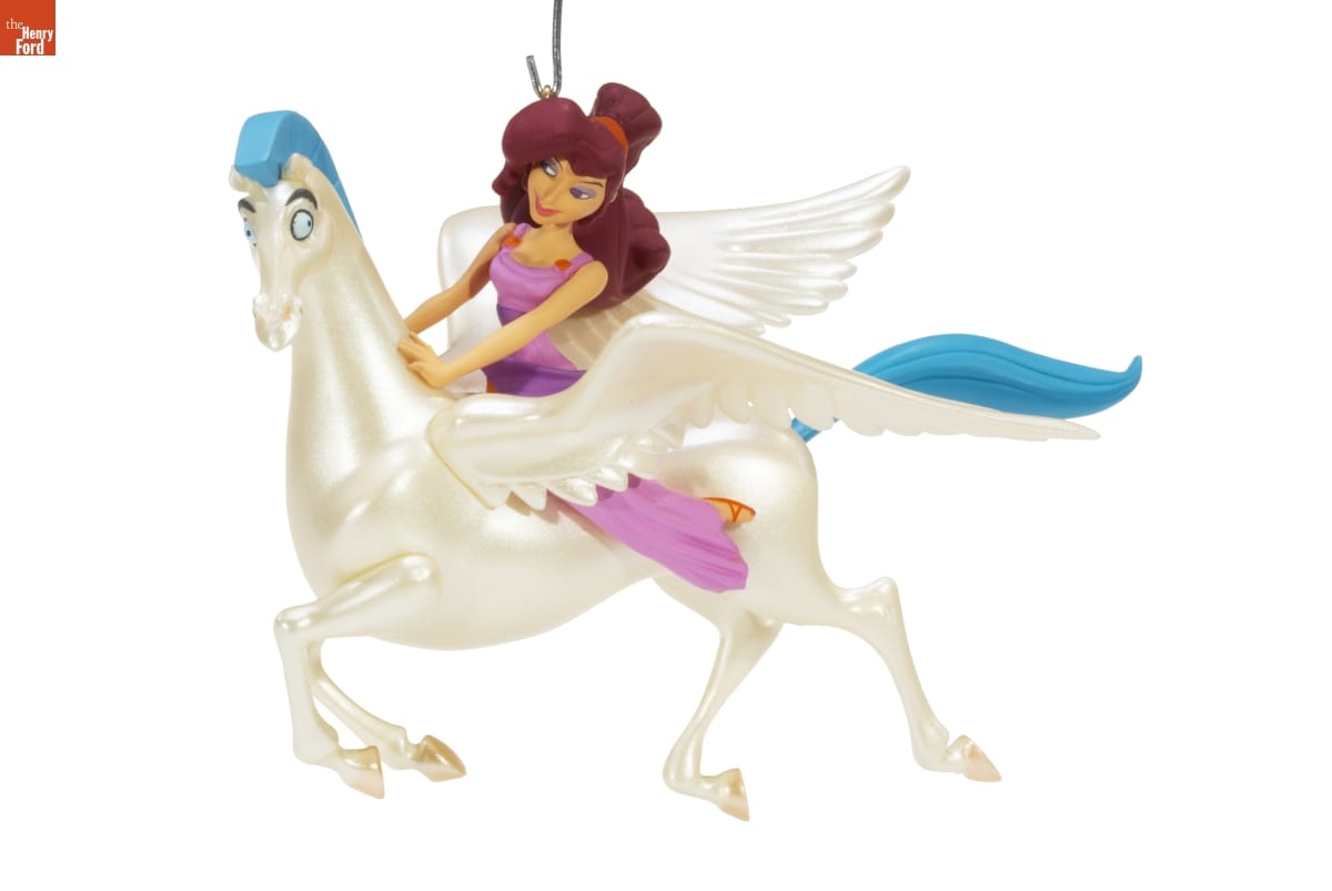 In Disney's animated feature, Hercules, Megara, / "Meg," is as strong as she is beautiful. She stands / up to Nessus, saves Hercules from a falling / column, and keeps everybody laughing with her / sassy sense of humor. Hercules thinks Meg is / incredible. She's smart, she's funny, and she's / the prettiest girl he's ever seen. / This Keepsake Ornament pictures Meg with / Pegasus, the winged horse that has been / Hercules' loyal friend since childhood. / Another Keepsake Ornamet, depicting the / heroic Hercules with his bow and arrow, is / available at your Hallmark retailer. / For decorative use only. Not for small children. / Handcrafted