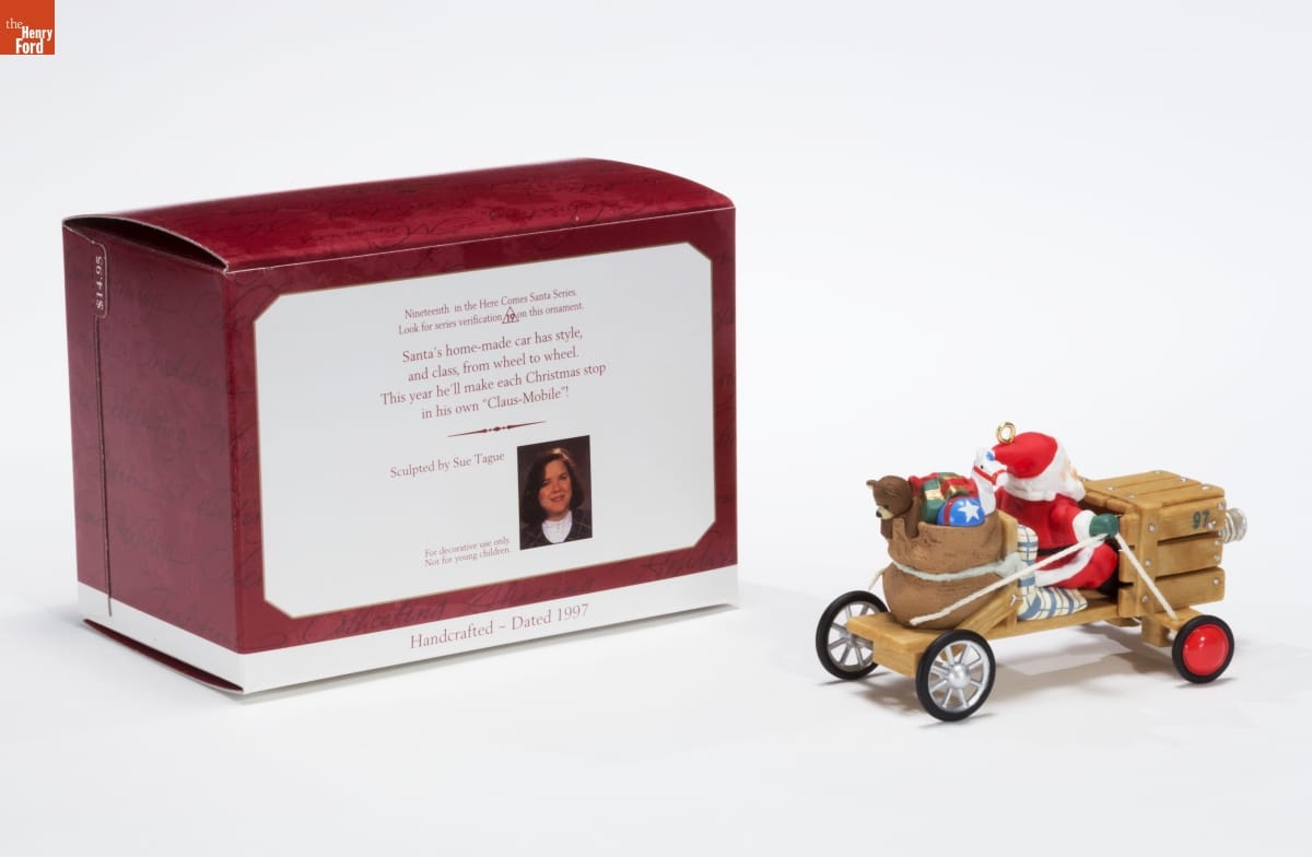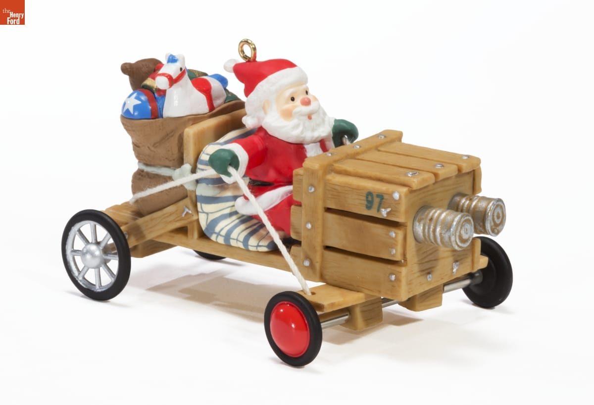 Hallmark's long-running "Here Comes Santa" series featured jolly St. Nick using different forms of transportation. The series began in 1979 depicting Santa driving an antique car. By the time the series ended in 2003, Santa had hopped a ride on a range of vehicles, including a fire truck, golf cart, rocket, snowplow, tractor, trolley, semitruck, and a Soap Box Derby car.