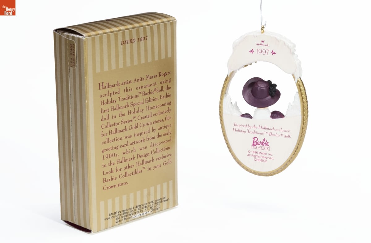 DATED 1997 / Hallmark artist Anita Marra Rogers / sculpted this ornament using / Holidays Traditions (TM) Barbie (R) doll, the / first Hallmark Special Edition Barbie / doll in the Holiday Homecoming / Collector Series (TM). Created exclusiviely / for Hallmark Gold Crowns stores, this / collection was inspired by antique / greeting card artwork from the early / 1900s, which was discovered / in the Hallmark Design Collections. / Look for other Hallmark exclusive / Barbie Collectibles(TM) in your Gold / Crown store. / BARBIE and associated trademarks are owned by and used / under license from Mattel, Inc. (C) 1996 Mattel, Inc. All Rights Reserved. / Mfd. for Hallmark Cards, Inc., K.C., MO 64141 / Made in Thailand QHB6002
