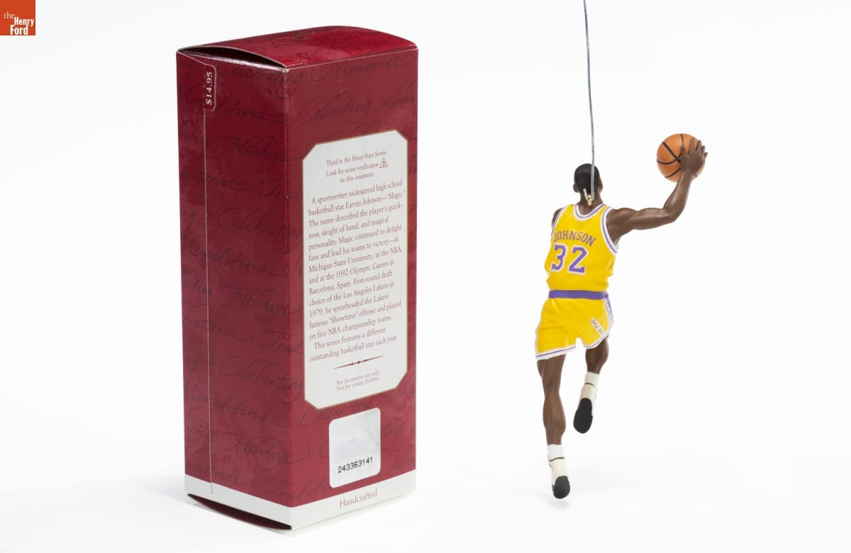 Third in the Hoop Stars Series / Look for series verification 3 / on this ornament. / A sportswriter nicknamed high school / basketball star Earvin Johnson--"Magic". / The name described the player's quick- / ness, / slight of hand, and magical / personality. Magic continued to delight / fans and lead his teams to victory--at / Michigan State University, in the NBA, / and at the 1992 Olympic Games in / Barcelona, Spain. First-round draft / choice of the Los Angeles Lakers in / 1979, he spearheaded the Lakers' / famous "Showtime" offense and played / on five NBA championship teams. / This series features a different / outstanding basketball star each year. / For decorative use only. / Not for young children. / Handcrafted