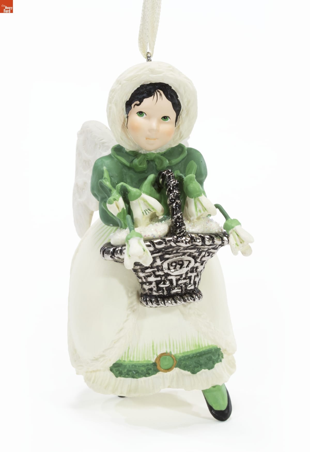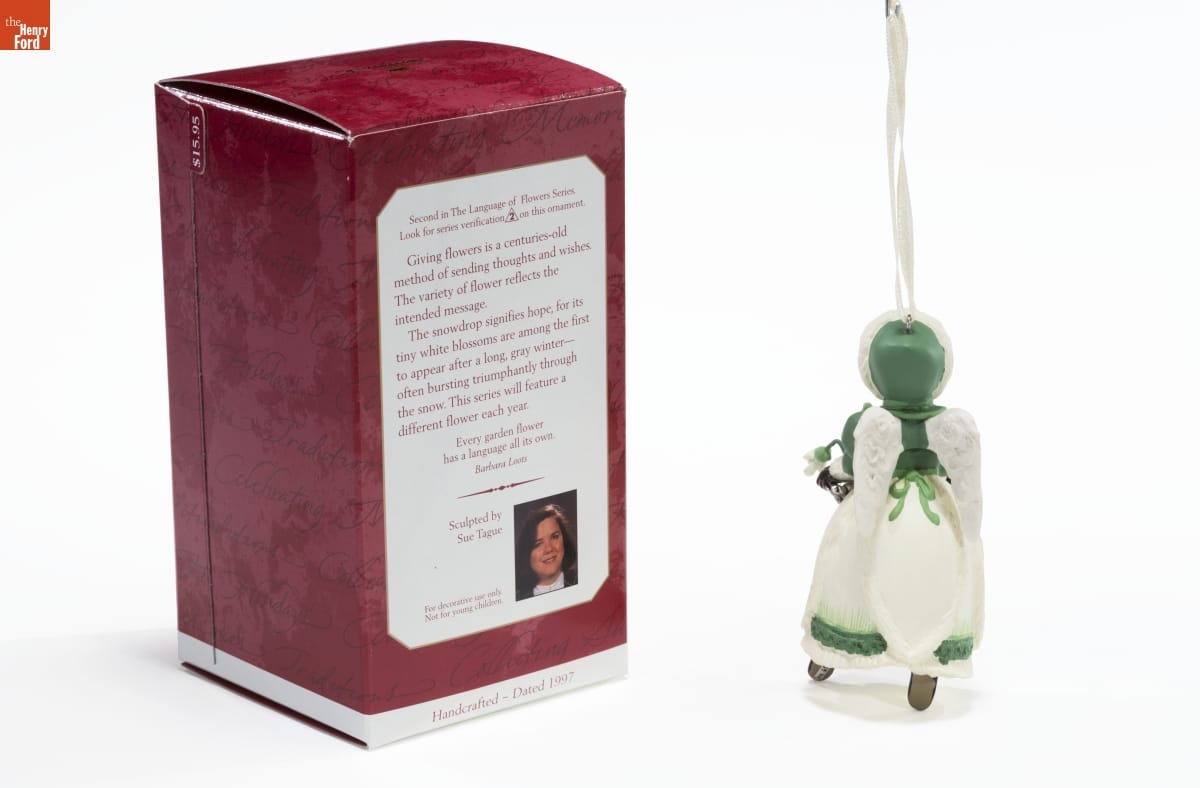 Second in The Language of Flowers Series. / Look for series verification 2 on this ornament. / Giving flowers is a centuries-old / method of sending thoughts and wishes. / The variety of flower reflects the / intended message. / The snowdrop signifies hope, for its / tiny white blossoms are among the first / to appear after a long, gray winter-- / often bursting triumphantly through / the snow. This series will feature a / different flower each year. / Every garden flower / has a language all its own / Barbara Loots / Sculpted by / Sue Tague / For decorative use only. / Not for young children. / Handcrafted - Dated 1997