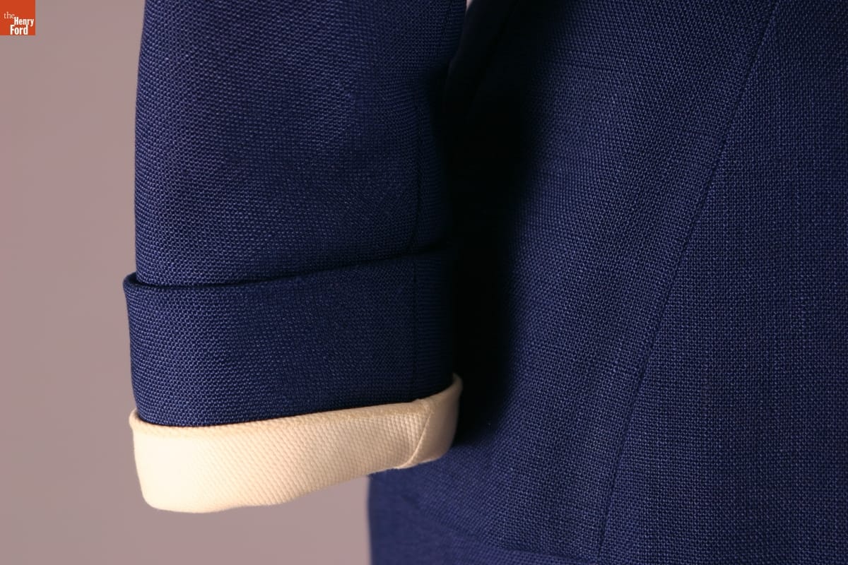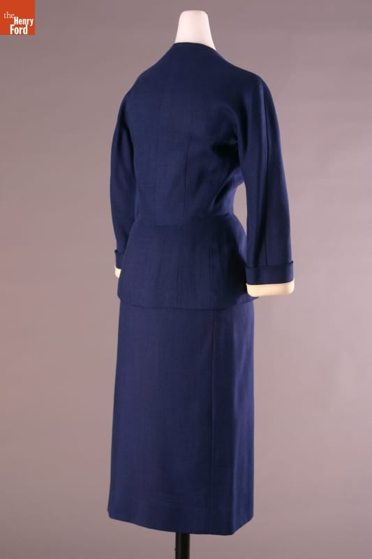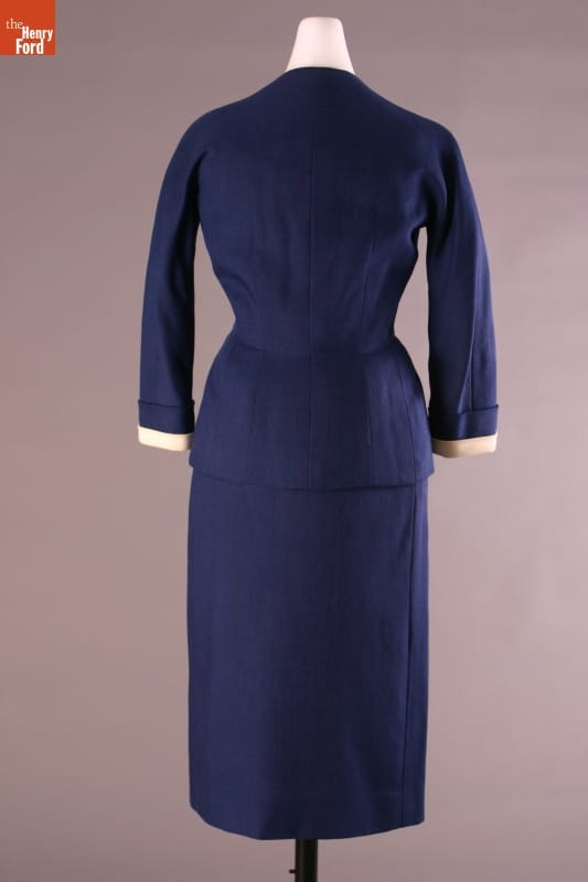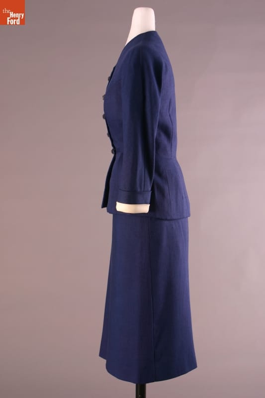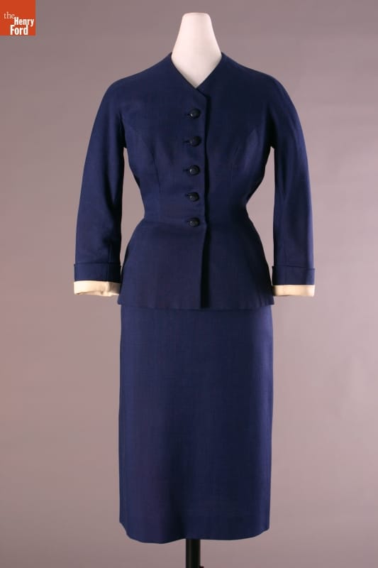 Elizabeth Parke Firestone, wife of tire magnate Harvey S. Firestone, Jr., cultivated a refined sense of fashion through years of interest in clothing design and collaboration with world-renowned couturiers. Firestone, who favored blue, frequented several well-known Paris design houses. This navy suit was designed by Cristobal Balenciaga.