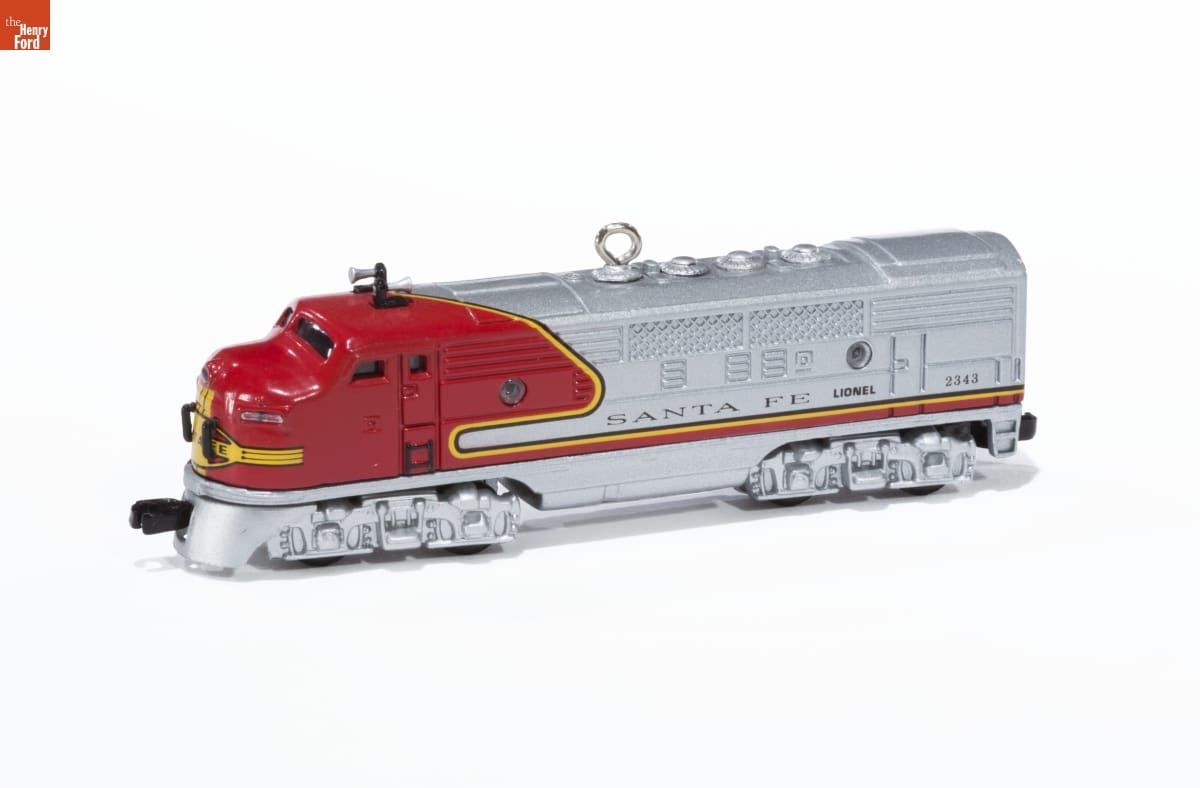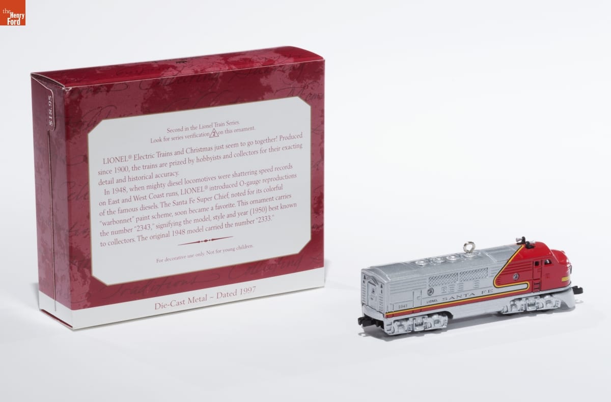 Second in the Lionel Train Series. / Look for series verification 2 on this ornament. / LIONEL(R) Electric Trains and Christmas just seem to go together! Produced / since 1900, the trains are prized by hobbyists and collectors for their exacting / detail and historical accuracy. / In 1948, when mighty diesel locomotives were shattering speed records / on East and West Coast runs, LIONEL(R) introduced O-gauge reproductions / of the famous diesels. The Santa Fe Super Chief, noted for its colorful / "warbonnet" paint scheme, soon became a favorite. This ornament carries / the number "2343," signifying the model, style and year (1950) best known / to collectors. The original 1948 model carried the number "2333." / For decorative use only. Not for young children / Die-Cast Metal - Dated 1997
