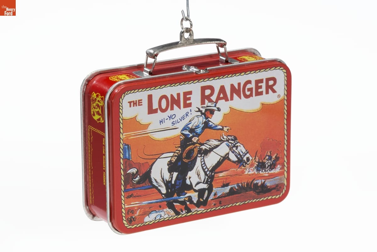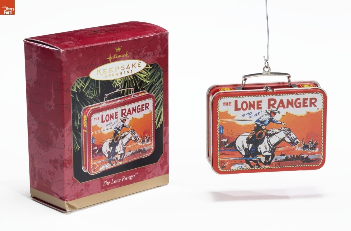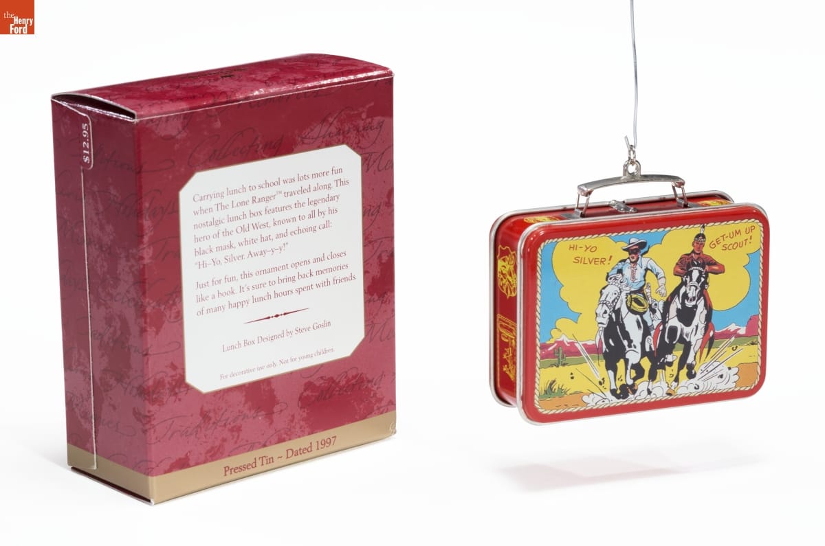 Carrying lunch to school was lots more fun / when The Lone Ranger traveled along. This / nostalgic lunch box features the legendary / hero of the Old West, known to all by his / black mask, white hat, and echoing call. / "Hi-Yo, Silver. Away-y-y!" / Just for fun, this ornament opens and closes / like a book. It's sure to bring back memories / of many happy lunch hours spent with friends. / Lunch Box Designed by Steve Goslin / For decorative use only. Not for young children. / Pressed Tin - Dated 1997