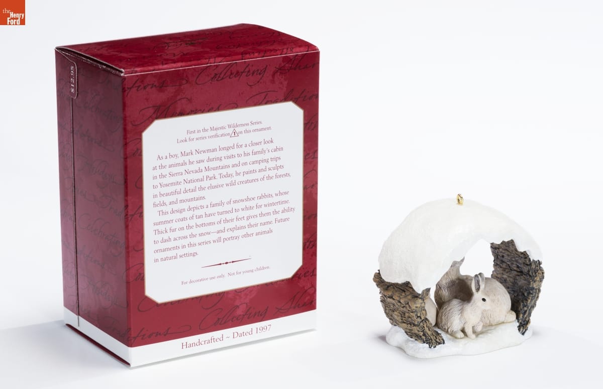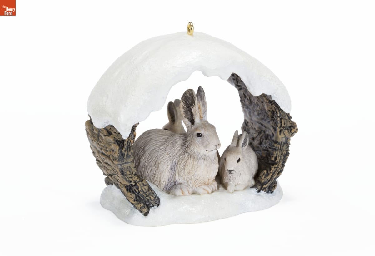 First in the Majestic Wilderness Series. / Look for series verification 1 on this ornament. / As a boy, Mark Newman longed for a closer look / at the animals he saw during visits to his family's cabin / in the Sierra Nevada Mountains and on camping trips / to Yosemite National Park. Today, he paints and sculpts / in beautiful detail the elusive wild creatures of the forests, / fields, and mountains. / This design depicts a family of snowshoe rabbits, whose / summer coats of tan have turned to white for wintertime. / Thick fur on the bottoms of their feet gives them the ability / to dash across the snow--and explains their name. Future / ornaments in this series will portray other animals / in natural settings. / For decorative use only. Not for young children. / Handcrafted - Dated 1997