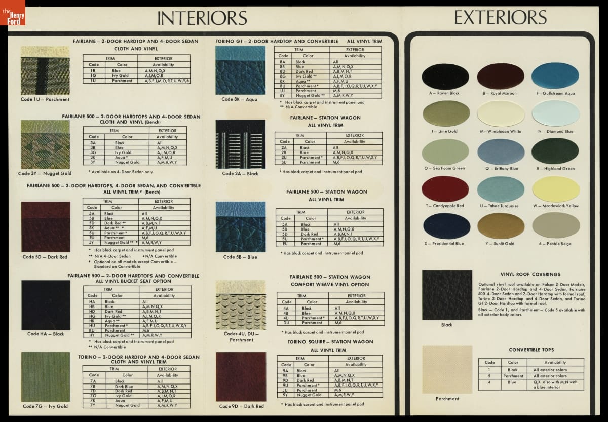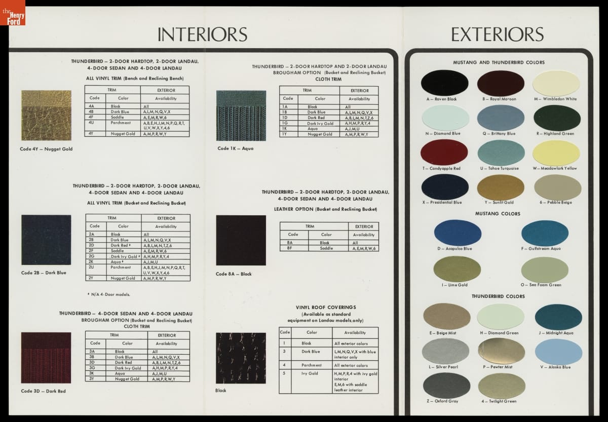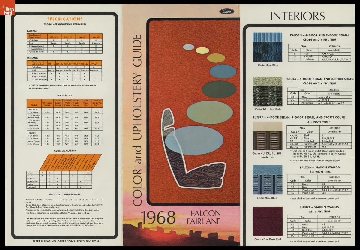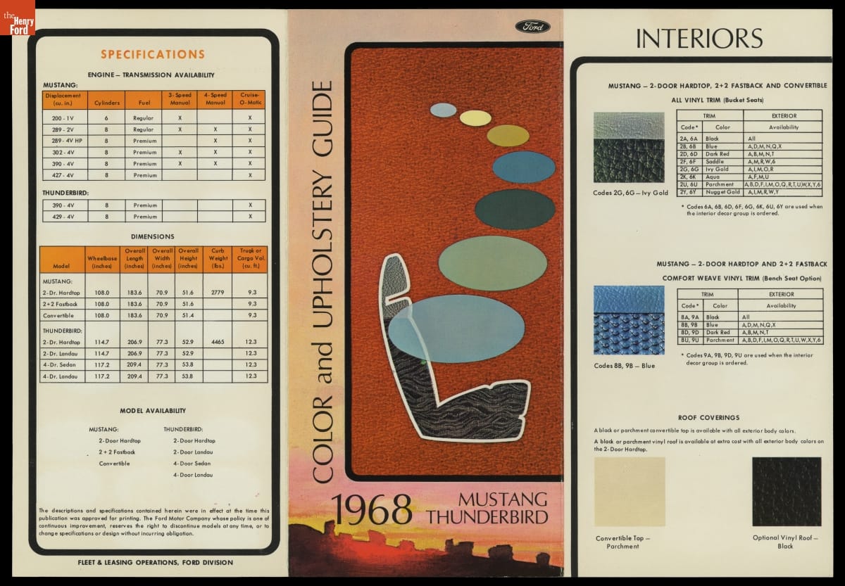 Ford Motor Company's color and upholstery guides provided dealers and customers with a look at exterior and interior color options for Ford automobiles. The brochures contained paint samples of available exterior finishes, and fabric samples of cloth, vinyl and leather interior upholsteries. Options presented in early-release advanced guides were always subject to change.