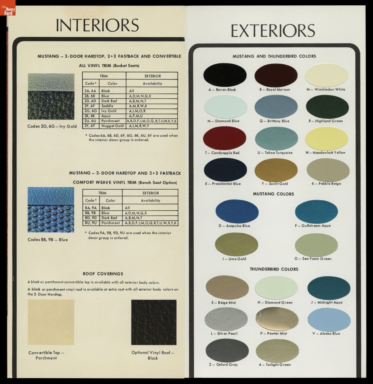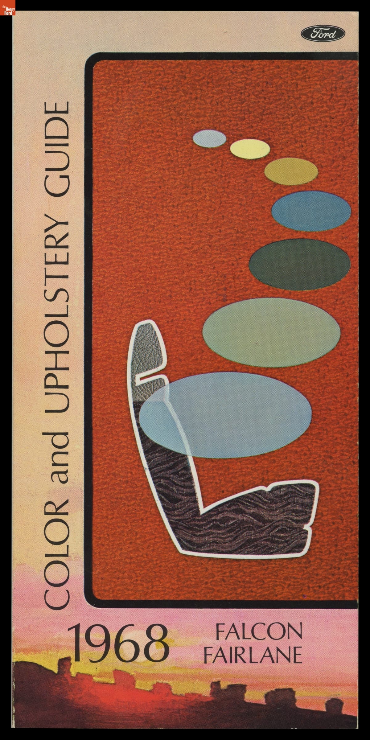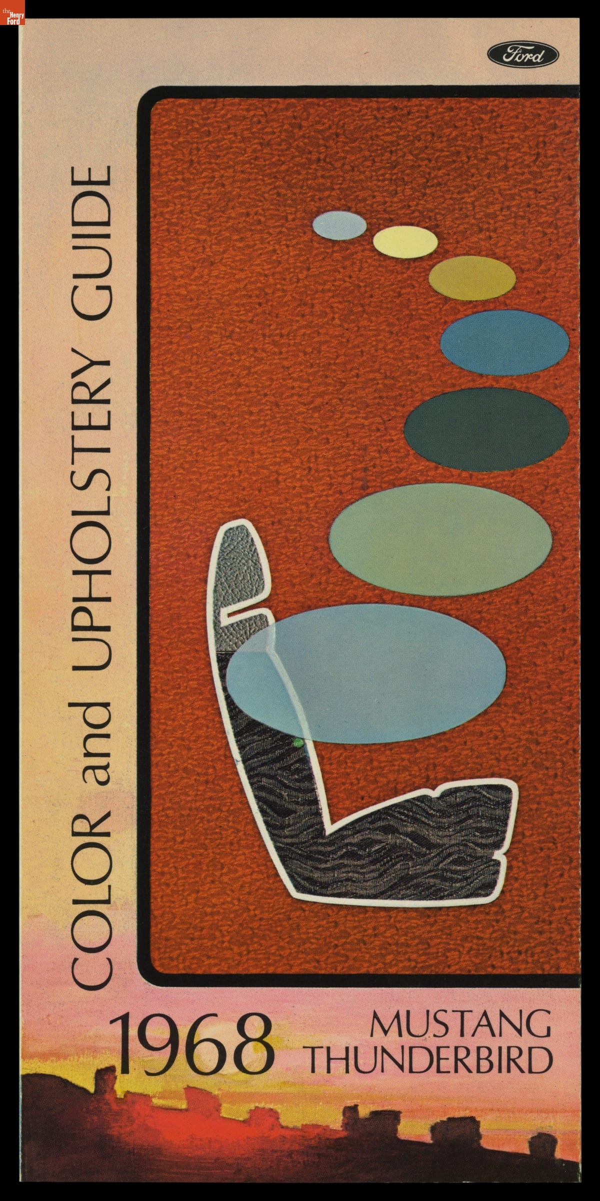 Ford Motor Company's color and upholstery guides provided dealers and customers with a look at exterior and interior color options for Ford automobiles. The brochures contained paint samples of available exterior finishes, and fabric samples of cloth, vinyl and leather interior upholsteries. Options presented in early-release advanced guides were always subject to change.