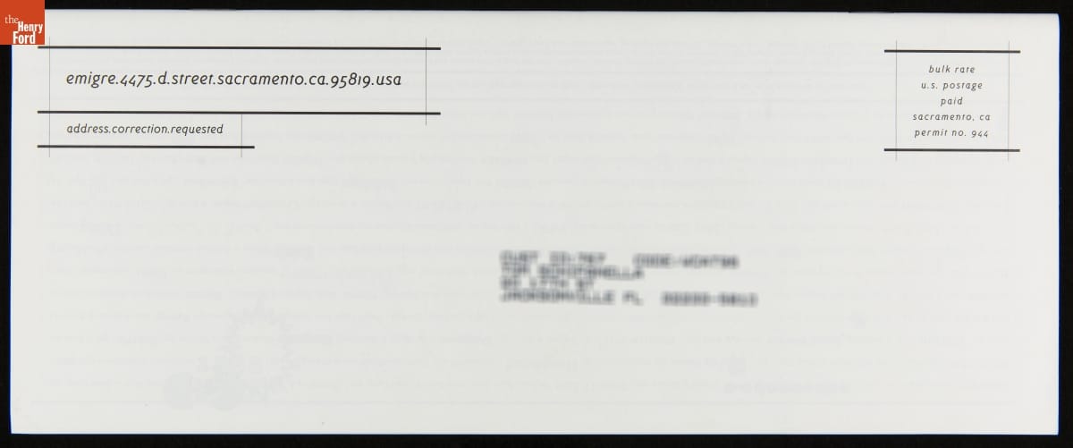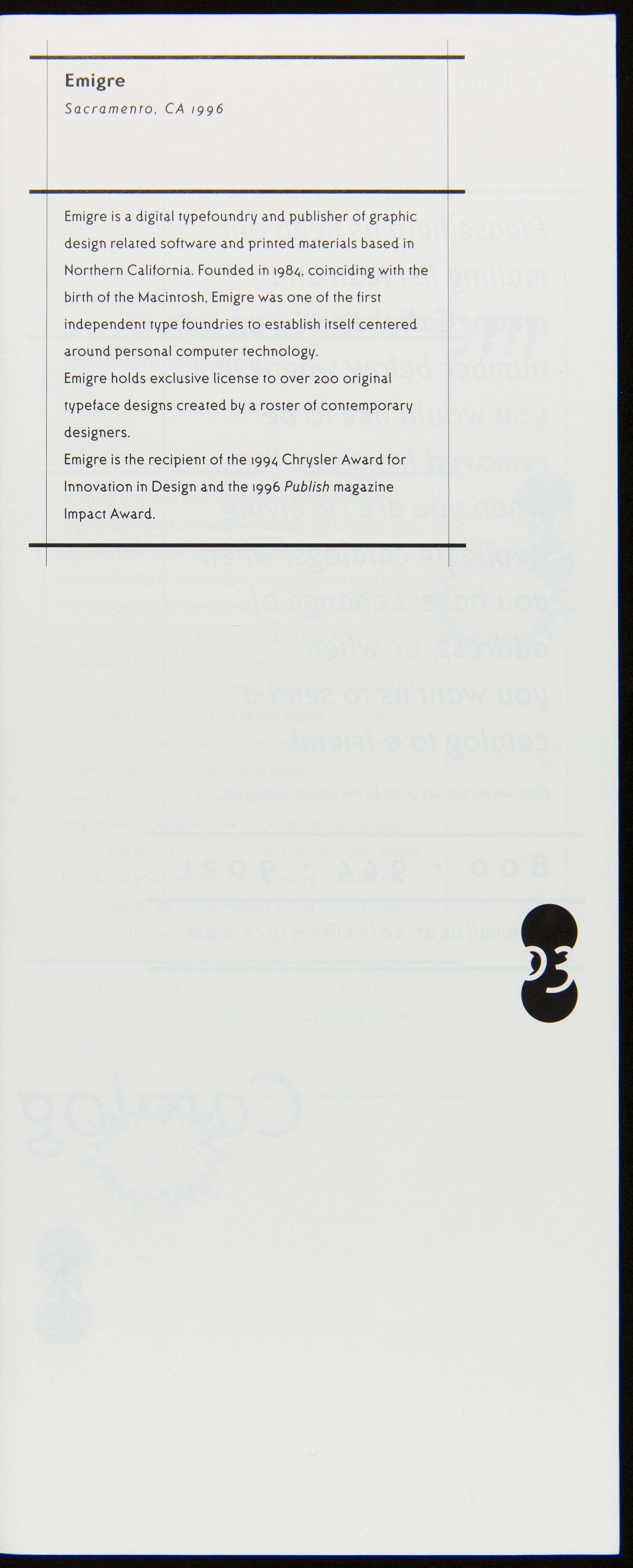 Emigre is a digital type foundry established by Rudy VanderLans and Zuzana Licko. The company's history is linked with the introduction of the 1984 Macintosh computer, used to design their early bitmapped typefaces. Emigre's digital work gained notoriety -- defying visual communication standards with fractured, layered combinations of text and image. This item advertised fonts or other items available for purchase.