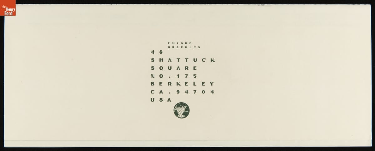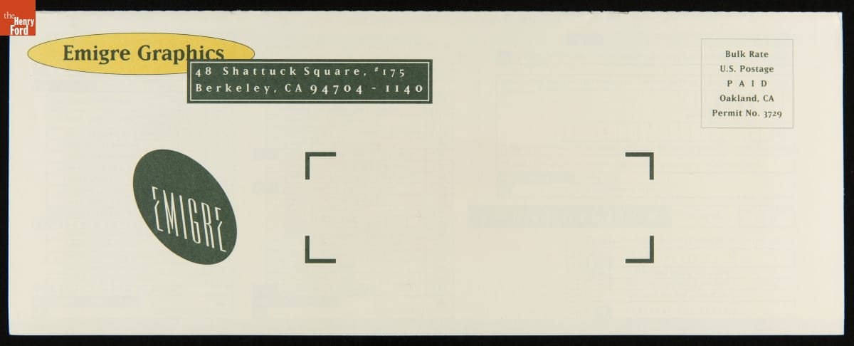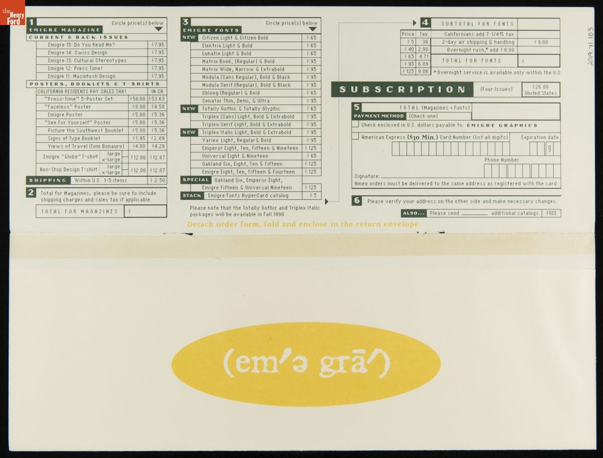 Emigre is a digital type foundry established by Rudy VanderLans and Zuzana Licko. The company's history is linked with the introduction of the 1984 Macintosh computer, used to design their early bitmapped typefaces. Emigre's digital work gained notoriety -- defying visual communication standards with fractured, layered combinations of text and image. This item advertised fonts or other items available for purchase.