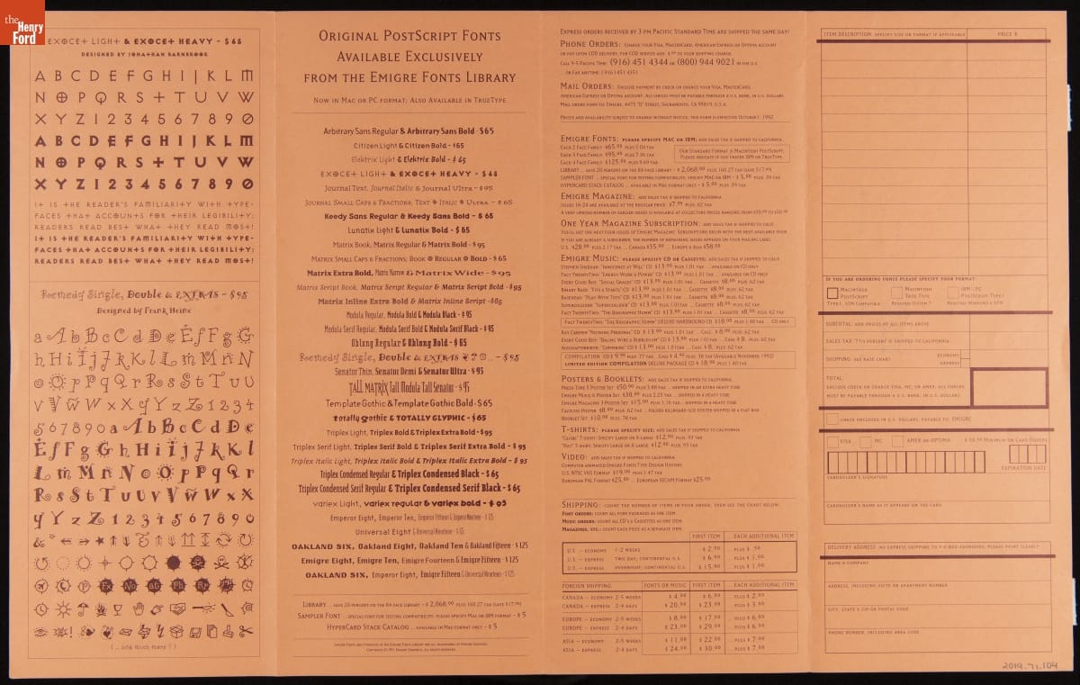 Emigre is a digital type foundry established by Rudy VanderLans and Zuzana Licko. The company's history is linked with the introduction of the 1984 Macintosh computer, used to design their early bitmapped typefaces. Emigre's digital work gained notoriety -- defying visual communication standards with fractured, layered combinations of text and image. This item advertised fonts or other items available for purchase.