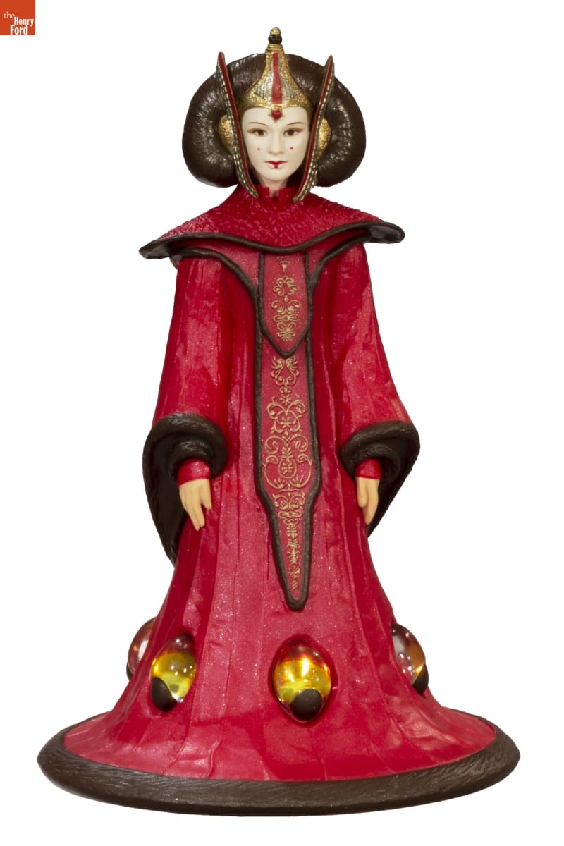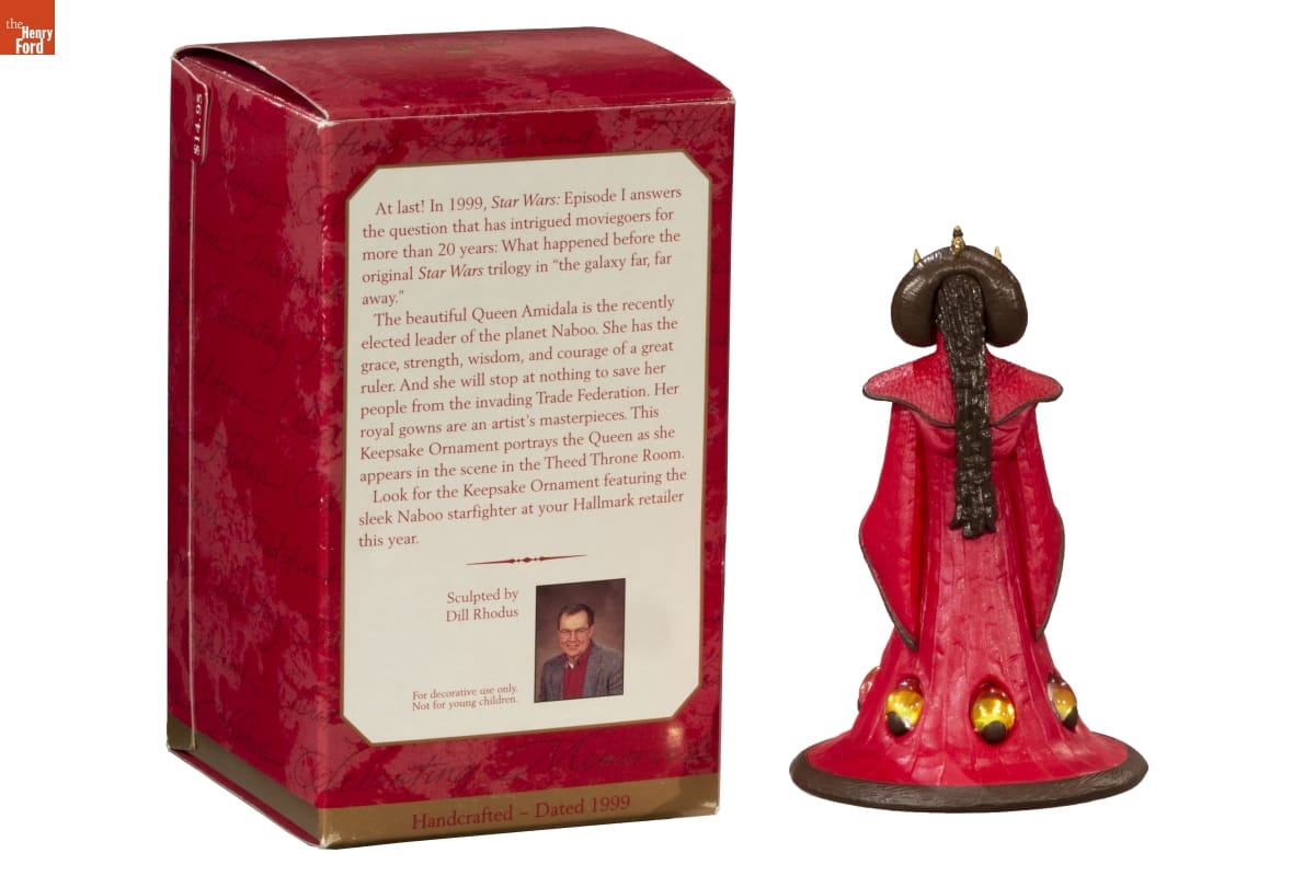 At last! In 1999, Star Wars: Episode 1 answers / the question that has intrigued moviegoers for / more than 20 years: What happened before the / original Star Wars trilogy in "the galaxy far, far / away." / The beautiful Queen Amidala is the recently / elected leader of the planet Naboo. She has the / grace, strength, wisdom, and courage of a great / ruler. And she will stop at nothing to save her / people from the invading Trade Federation. Her / royal gowns are an artist's masterpieces. This / Keepsake Ornament portrays the Queen as she / appears in the scene in the Theed Throne Room. / Look for the Keepsake Ornament featuring the / sleek Naboo starfighter at your Hallmark retailer / this year. / Sculpted by / Dill Rhodus / For decorative use only. / Not for young children. / Handcrafted - Dated 1999