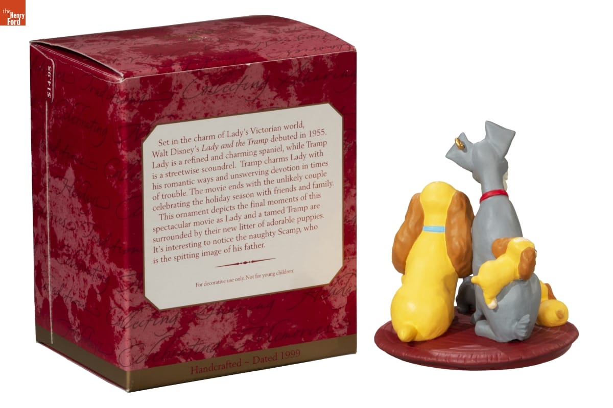Set in the charm of Lady's Victorian world, / Walt Disney's Lady and the Tramp debuted in 1955, / Lady is a refined and charming spaniel, while Tramp / is a streetwise scoundrel. Tramp charms Lady with his romantic ways and unswerving devotion in times / or trouble. The movie ends with the unlikely couple / celebrating the holiday season with friends and family. / This ornament depicts the final moments of this / spectacular movie as Lady and a tamed Tramp are / surrounded by their new litter of adorable puppies. / It's interesting to notice the naughty Scamp, who / is the spitting image of his father. / For decorative use only. Not for young children. / Handcrafted - Dated 1999