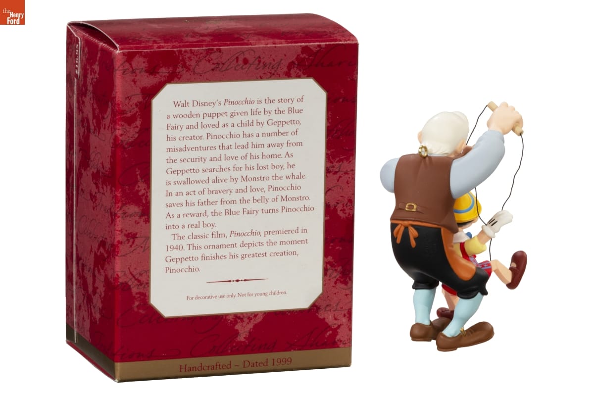 Walt Disney's Pinocchio is the story of / a wooden puppet given life by the Blue / Fairy and loved as a child by Geppetto, / his creator. Pinocchio has a number of / misadventures that lead him away from / the security and love of his home. As / Geppetto searches for his lost boy, he / is swallowed alive by Monstro the whale. / In an act of bravery and love, Pinocchio / saves his father from the belly of Monstro. / As a reward, the Blue Fairy turns Pinocchio / into a real boy. / The classic film, Pinocchio, premiered in / 1940. This ornament depicts the moment / Geppetto finishes his greatest creation, / Pinocchio. / For decorative use only. Not for young children. / Handcrafted - Dated 1999