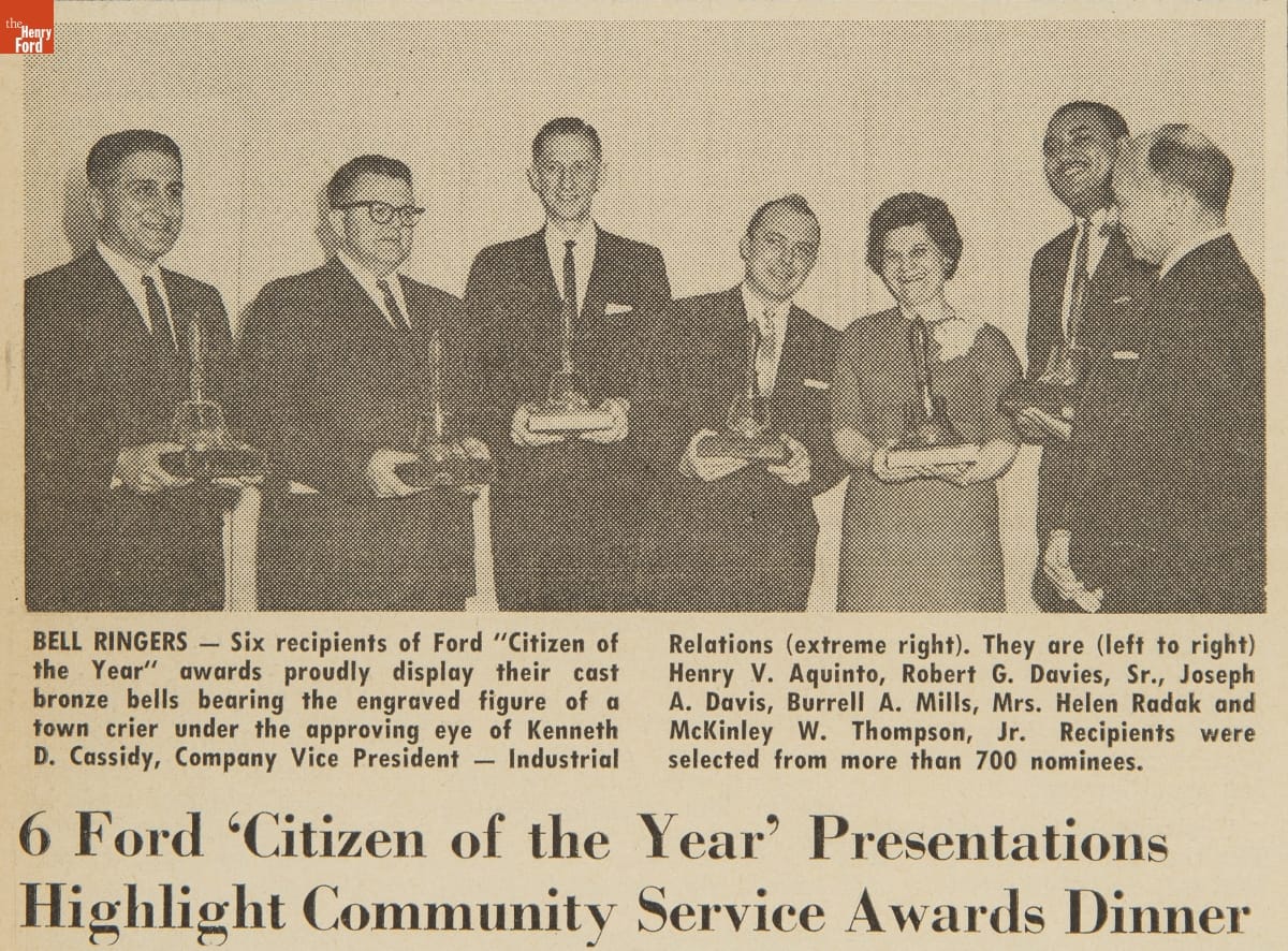Rouge News, the newsletter published for employees of Ford Motor Company's Rouge factory complex, celebrated winners of Ford's "Citizen of the Year" award in this issue from March 1962. According to the article, the six winners demonstrated outstanding service to their communities by volunteering in various charitable, civic, and youth-oriented activities.
