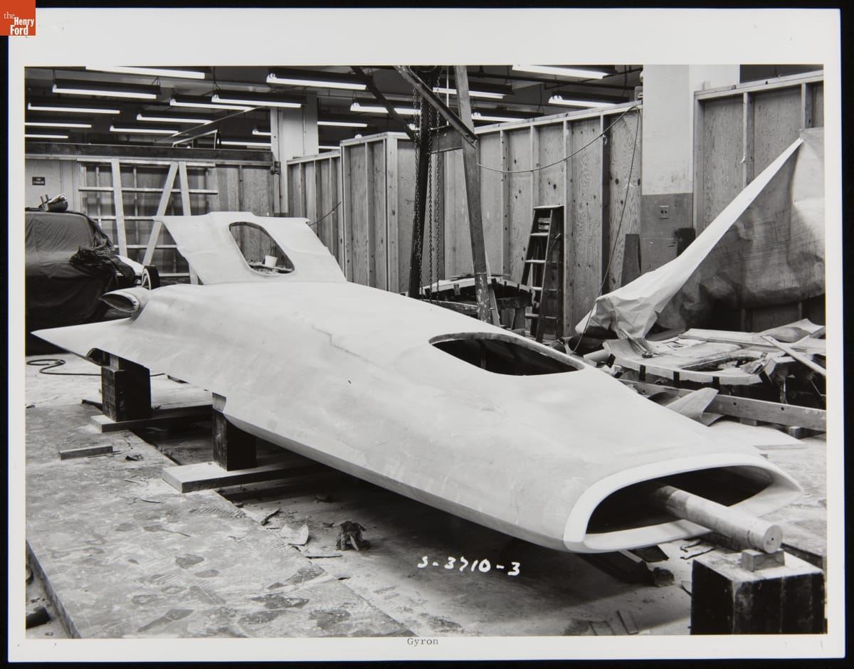 Ford Motor Company revealed its Gyron concept car in 1961. Designers intended for a gyroscope to keep the two-wheeled car upright, but the technology was too expensive for a show car. Instead, the fiberglass Gyron used outrigger wheels to keep its balance while an electric motor moved it at 5 mph. The Gyron was destroyed in the 1962 Ford Rotunda fire.