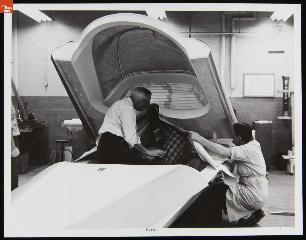 Ford Motor Company revealed its Gyron concept car in 1961. Designers intended for a gyroscope to keep the two-wheeled car upright, but the technology was too expensive for a show car. Instead, the fiberglass Gyron used outrigger wheels to keep its balance while an electric motor moved it at 5 mph. The Gyron was destroyed in the 1962 Ford Rotunda fire.