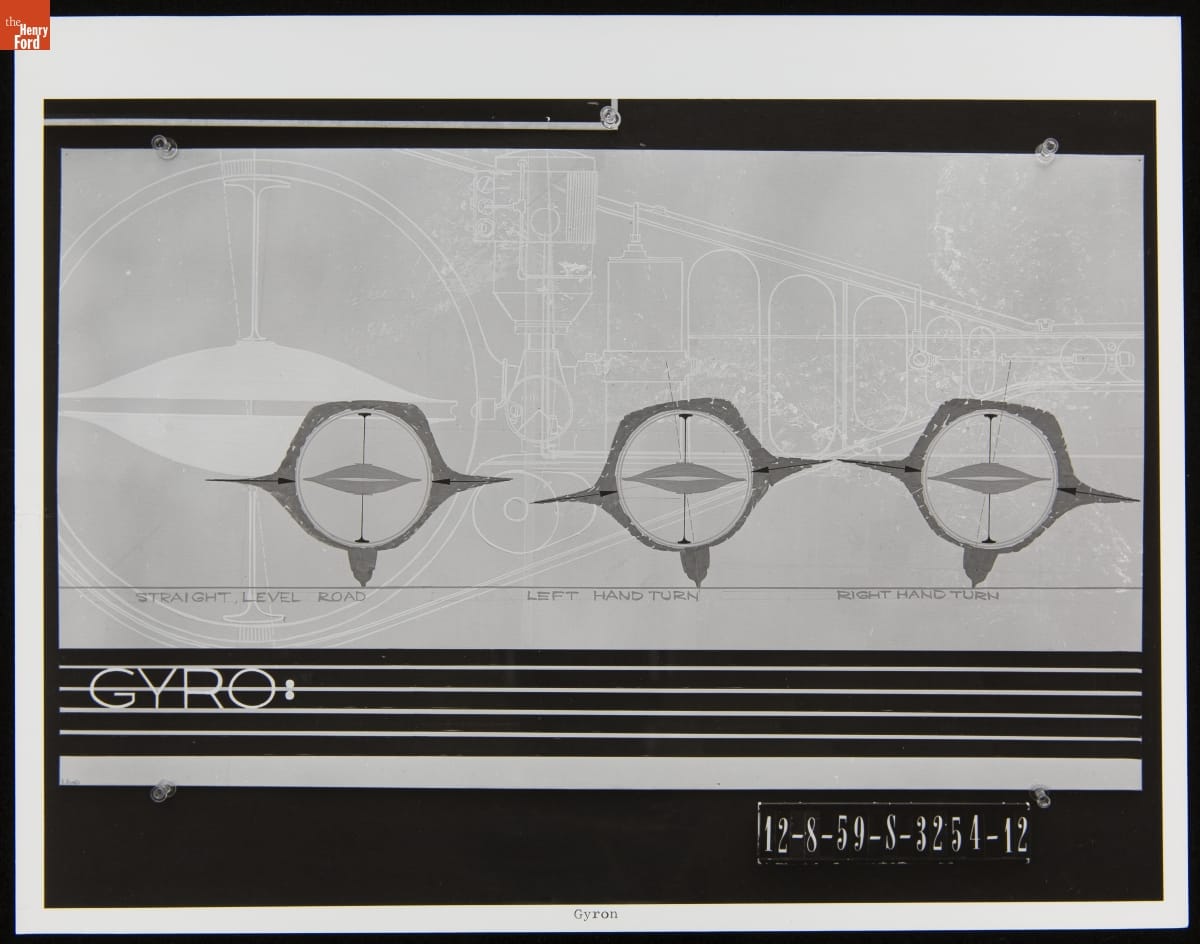 Ford Motor Company revealed its Gyron concept car in 1961. Designers intended for a gyroscope to keep the two-wheeled car upright, but the technology was too expensive for a show car. Instead, the fiberglass Gyron used outrigger wheels to keep its balance while an electric motor moved it at 5 mph. The Gyron was destroyed in the 1962 Ford Rotunda fire.
