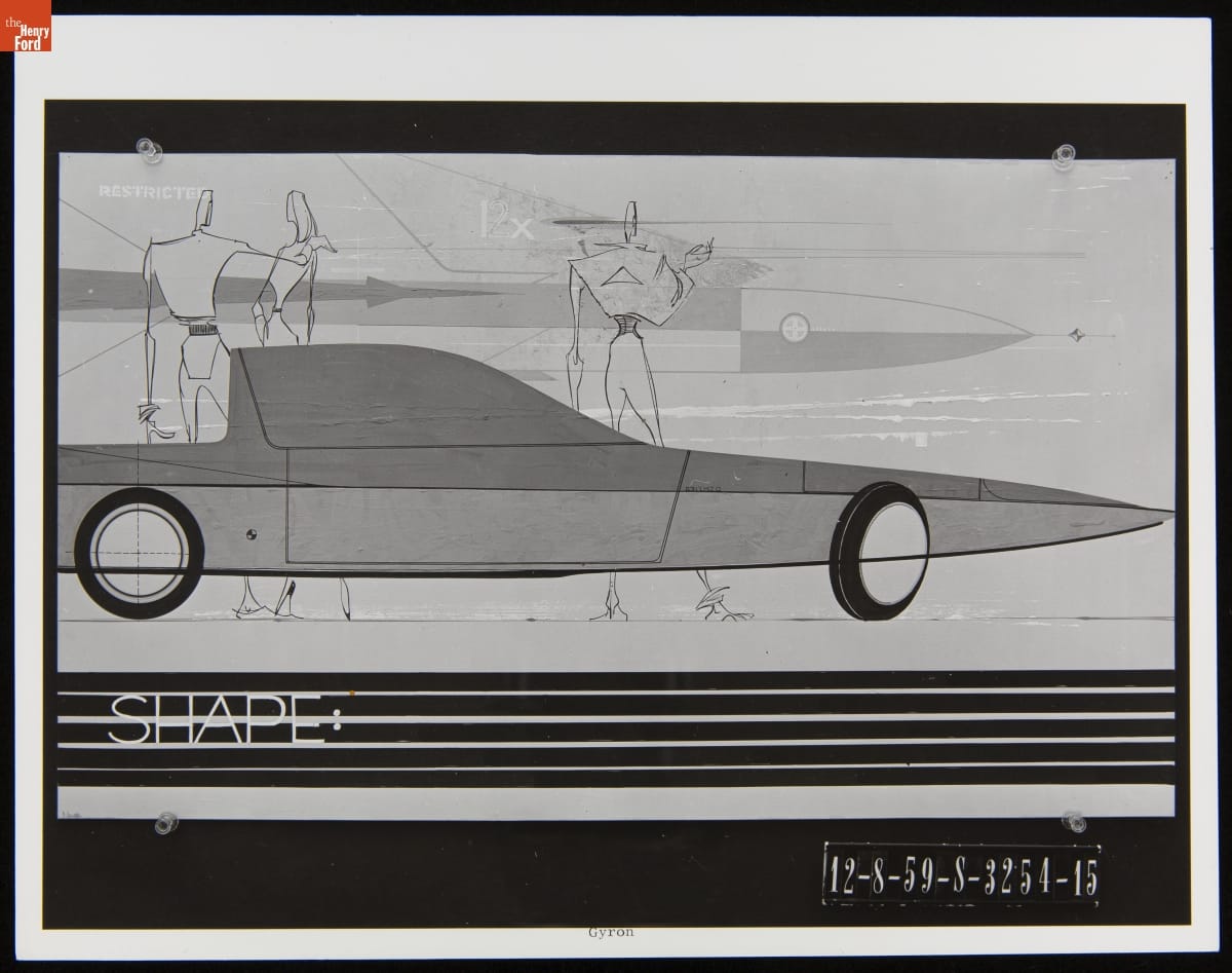Ford Motor Company revealed its Gyron concept car in 1961. Designers intended for a gyroscope to keep the two-wheeled car upright, but the technology was too expensive for a show car. Instead, the fiberglass Gyron used outrigger wheels to keep its balance while an electric motor moved it at 5 mph. The Gyron was destroyed in the 1962 Ford Rotunda fire.