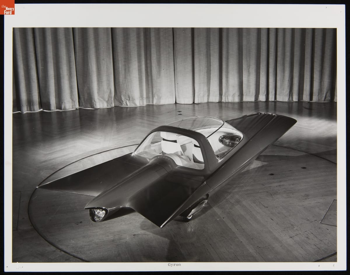Ford Motor Company revealed its Gyron concept car in 1961. Designers intended for a gyroscope to keep the two-wheeled car upright, but the technology was too expensive for a show car. Instead, the fiberglass Gyron used outrigger wheels to keep its balance while an electric motor moved it at 5 mph. The Gyron was destroyed in the 1962 Ford Rotunda fire.