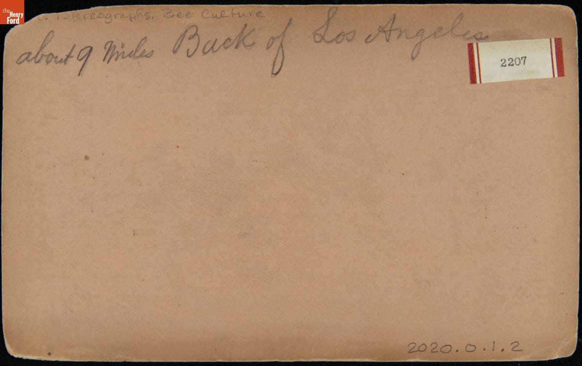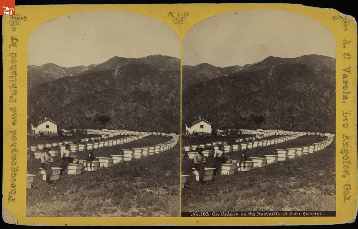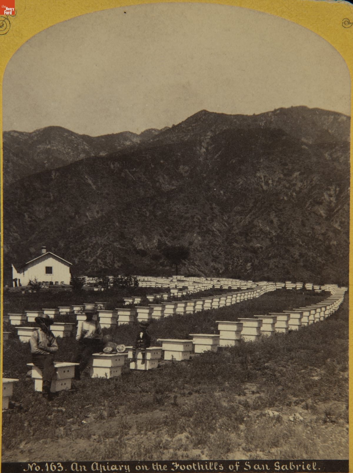 Missions in southern California raised fruit and vegetables to feed local populations. The temperate climate that supported year-round cultivation drew growers specializing in grapes, fruit trees, and berry bushes. Bees played a critical role in crop production. This stereograph indicates the investment viticulturalists and fruit-growers made in hives to sustain pollinators, the essential ingredient in their farming system.