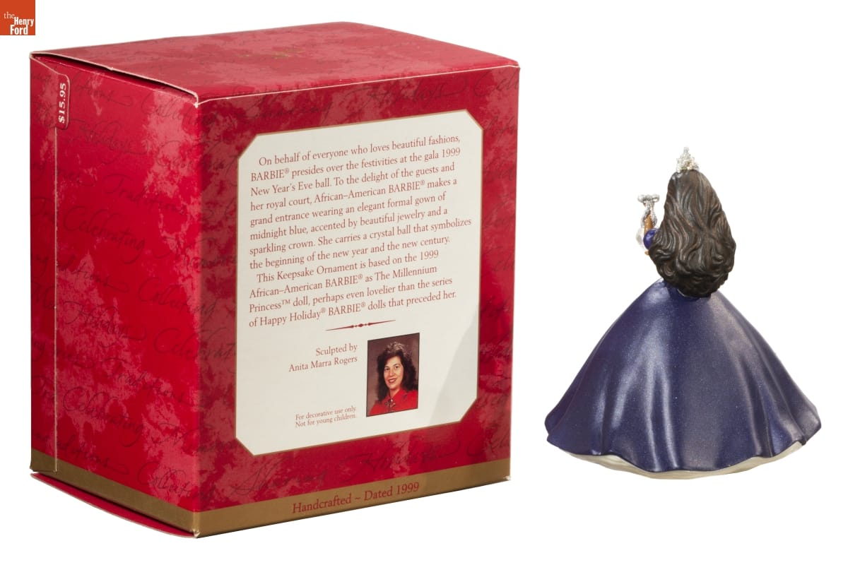 On behalf of everyone who loves beautiful fashions, / BARBIE presides over the festivities at the gala 1999 / New Year's Eve ball. To the delight of the guests and / her royal court, BARBIE makes a grand entrance as / The Millennium Princess. She wears an elegant / formal gown of midnight blue, accented by beautiful / jewelry and a sparkling crown. She carries a crystal ball / that symbolizes the beginning of the new year and the new century. / This Keepsake Ornament is based on the 1999 / BARBIE as The Millennium Princess doll, perhaps / even lovelier than the series of Happy Holiday / BARBIE dolls that preceded her. / Sculpted by / Anita Marra Rogers / For decorative use only. / Not for young children. / Handcrafted - Dated 1999