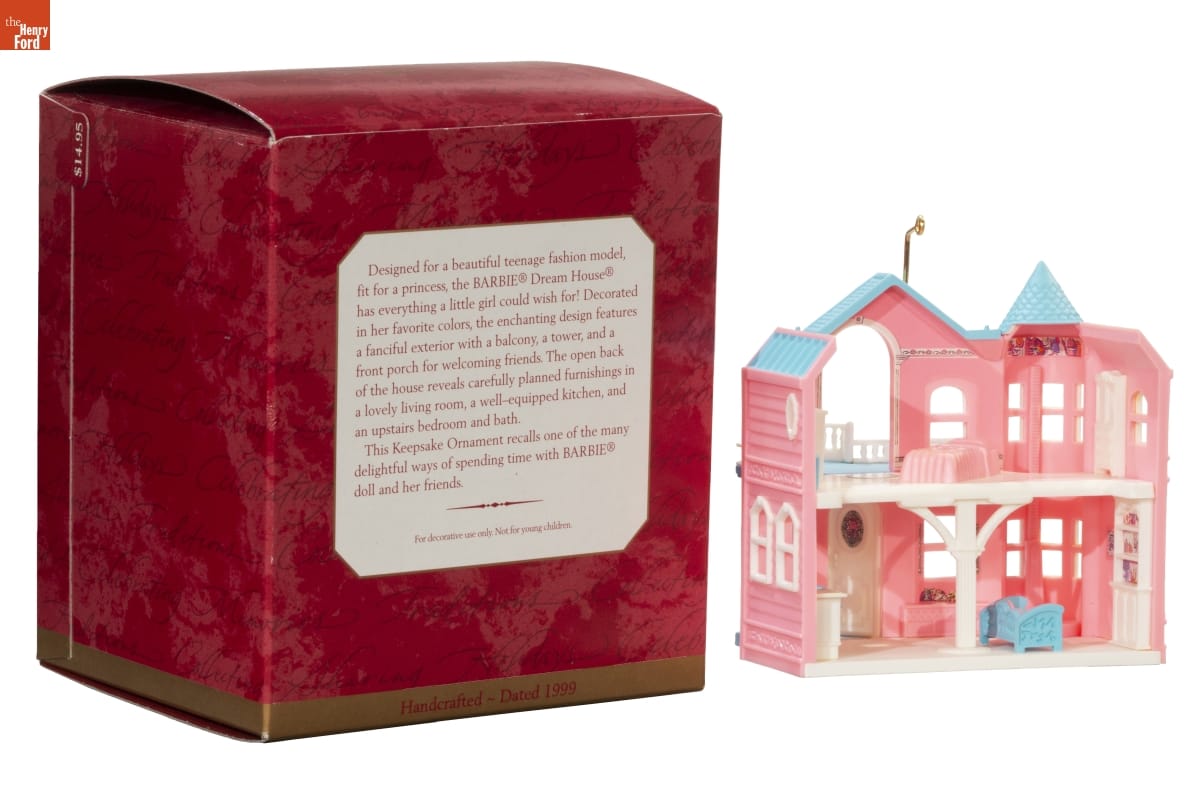 Designed for a beautiful teenage fashion model, / fit for a princess, the BARBIE Dream House / has everything a little girl could wish for! Decorated / in her favorite colors, the enchanting design features / a fanciful exterior with a balcony, a tower, and a / front porch for welcoming friends. The open back / of the house reveals carefully planned furnishings in / a lovely living room, a well-equipped kitchen, and / an upstairs bedroom and bath. / This Keepsake Ornament recalls one of the many / delightful ways of spending time with BARBIE / doll and her friends. / For decorative use only. Not for young children. / Handcrafted - Dated 1999