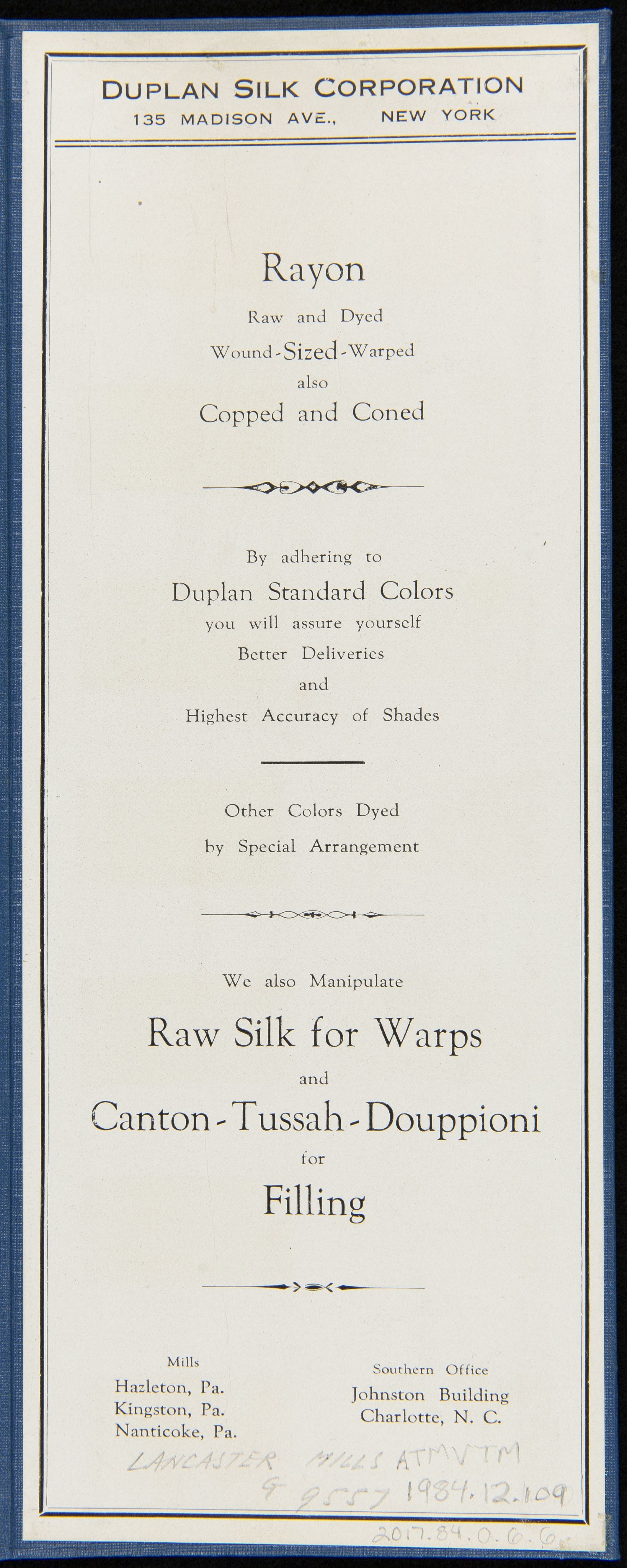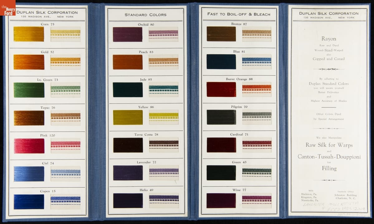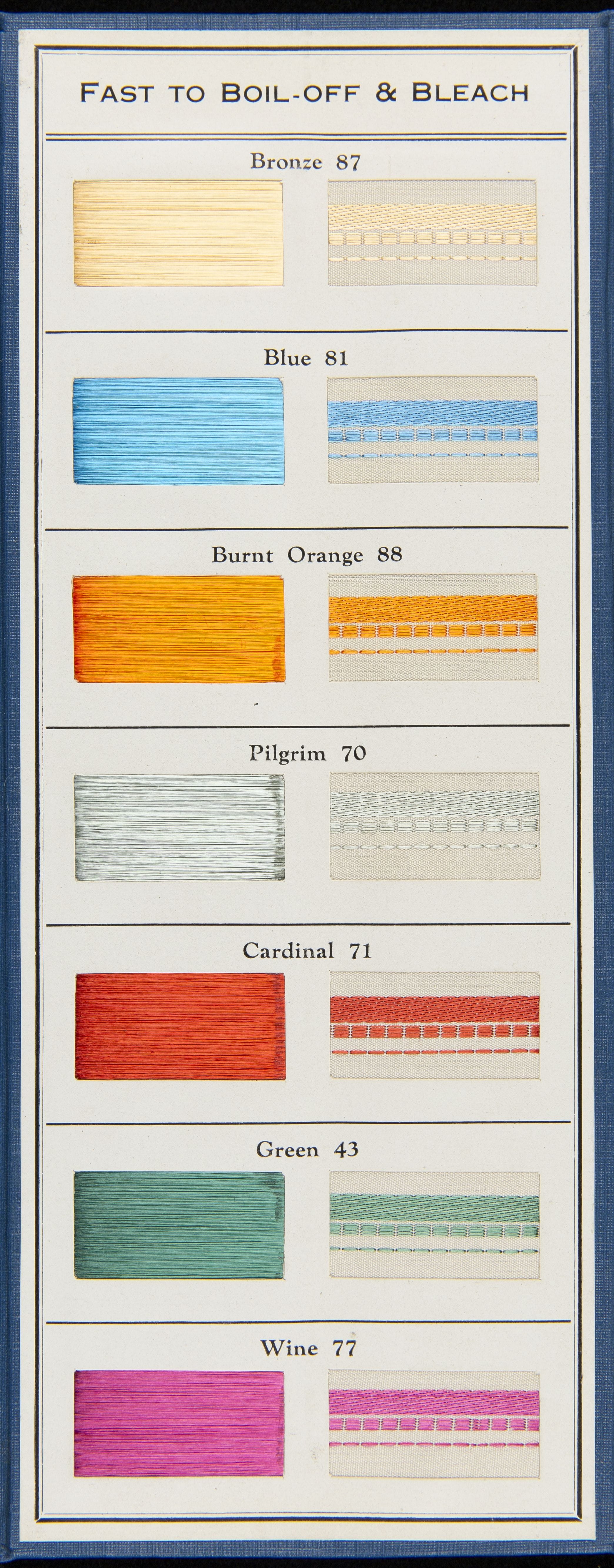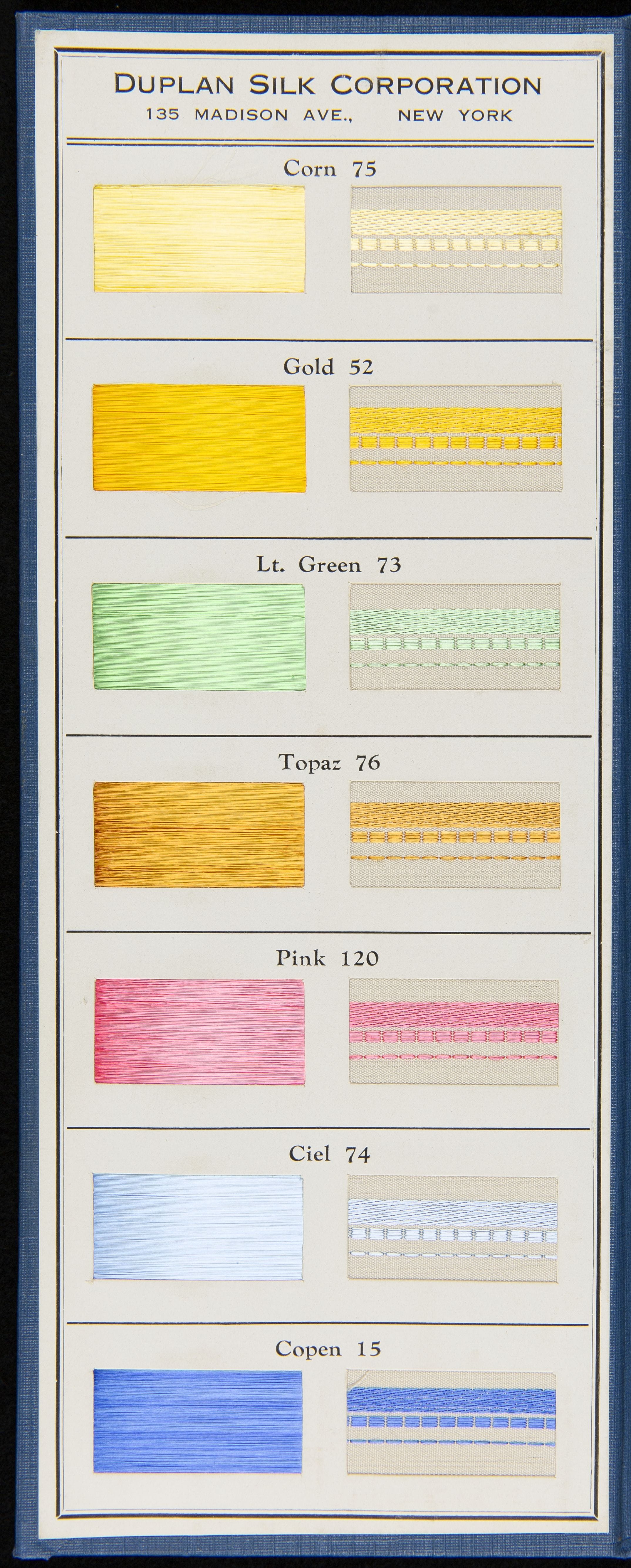 Sample Book for Duplan Silk Corp., "Rayon for Cotton Mills: Standard Colors, Card B," 1921-1940