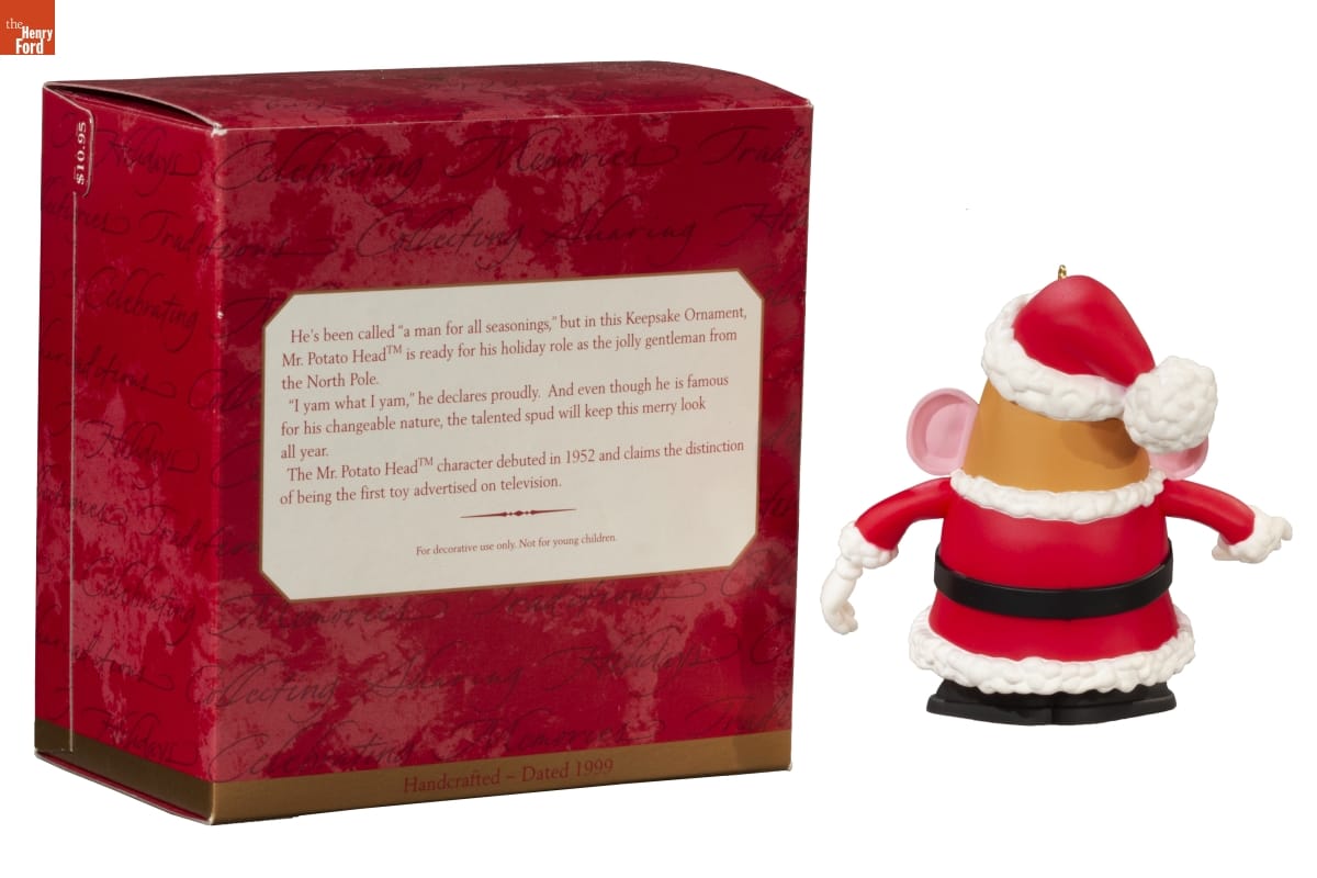 He's been called "a man for all seasonings," but in this Keepsake Ornament, / Mr. Potato Head is ready for his holiday role as the jolly gentleman from / the North Pole. / "I yam what I yam," he declares proudly. And even though he is famous / for his changeable nature, the talented spud will keep this merry look / all year. / The Mr. Potato Head character debuted in 1952 and claims the distinction / of being the first toy advertised on television. / For decorative use only. Not for young children. / Handcrafted - Dated 1999