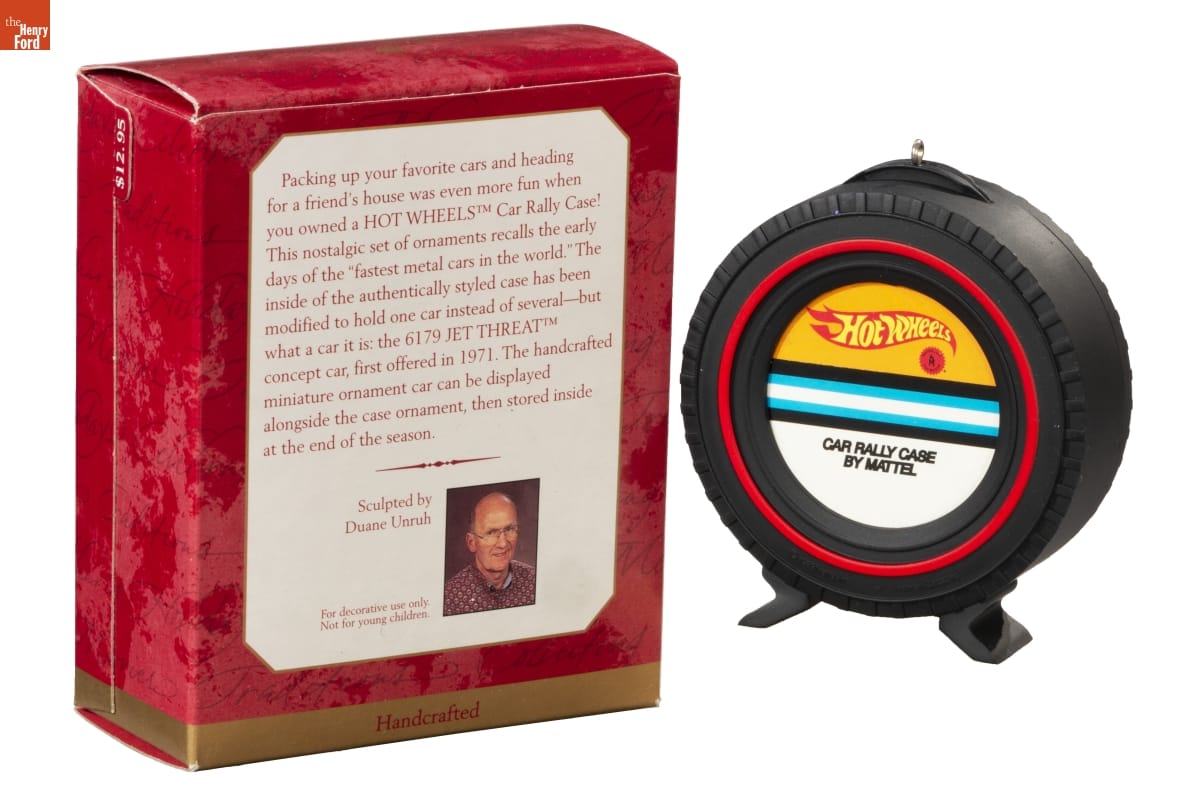 Packing up your favorite cars and heading / for a friend's house was even more fun when / you owned a HOT WHEELS Car Rally Case! / This nostalgic set of ornaments recalls the early / days of the "fastest metal cars in the world." The / inside of the authentically styled case has been / modified to hold one car instead of several-but / what a car it is: the 6179 JET THREAT / concept car, first offered in 1971. The handcrafted / miniature ornament care can be displayed / alongside the case ornament, then stored inside / at the end of the season. / Sculpted by / Duane Unruh / For decorative use only. / Not for young children. / Handcrafted