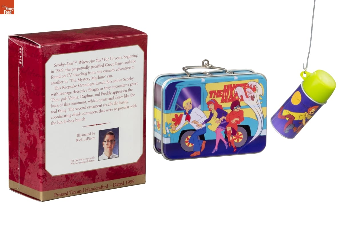 Scooby-Doo, Where Are You? For 15 years, beginning / in 1969, the perpetually petrified Great Dane could be / found on TV, traveling from one comedy adventure to / another in "The Mystery Machine" van. / This Keepsake Ornament Lunch Box shows Scooby / with teenage detective Shaggy as they encounter a ghost. / Their pals Velma, Daphne, and Freddy appear on the back of this ornament, which opens and closes like the / real thing. The second ornament recalls the handy, / coordinating drink containers that were so popular with / the lunch-box bunch. / Illustrated by / Rich LaPierre / For decorative use only. / Not for young children. / Pressed Tin and Handcrafted - Dated 1999