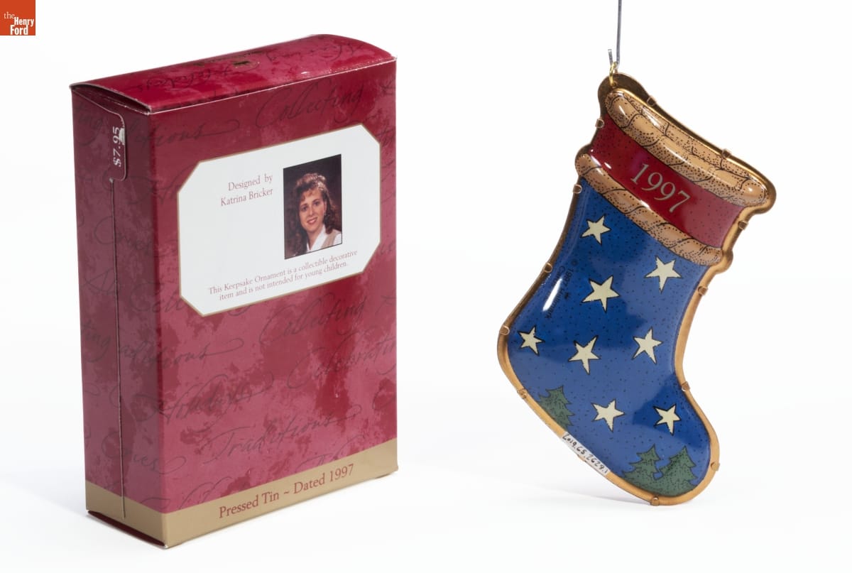 Designed by / Katrina Bricker / This Keepsake Ornament is a collectible decorative / item and is not intended for young children. / Pressed Tin - Dated 1997