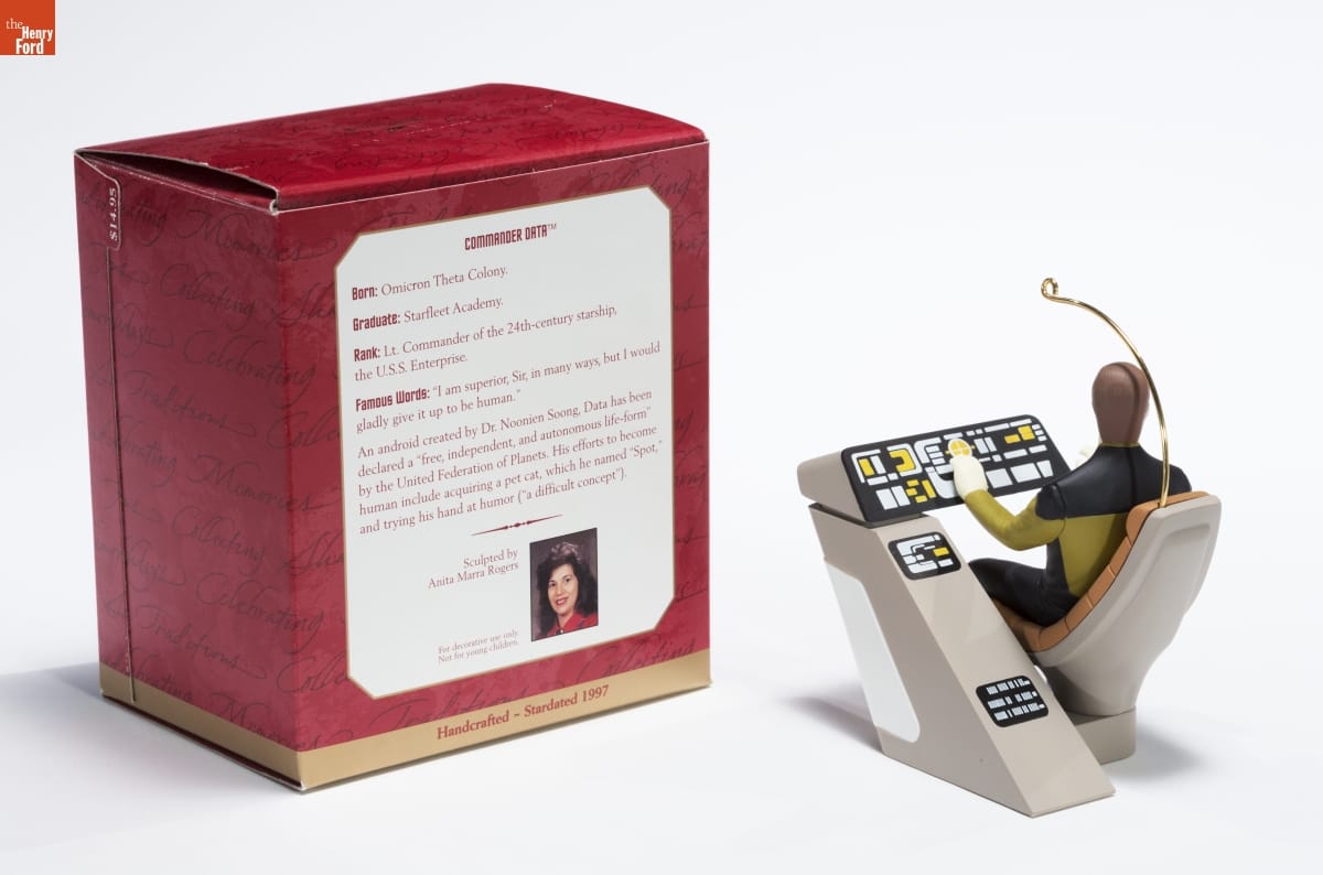 COMMANDER DATA(TM) / Born: Omicron Theta Colony. / Graduate: Starfleet Academy / Rank: Lt. Commander of the 24th-century starship, / the U.S.S. Enterprise. / Famous Words: "I am superior, Sir, in many ways, but I would / gladly give it up to be human." / An android created by Dr. Noonien Soong, Data has been / declared a "free, independent, and autonomous life-form" / by the United Federation of Planets. His efforts to become / human include acquiring a pet cat, which he named "Spot," / and trying his hand at humor ("a difficult concept"). / Sculpted by / Anita Marra Rogers / For decorative use only. / Not for young children / Handcrafted - Stardated 1997