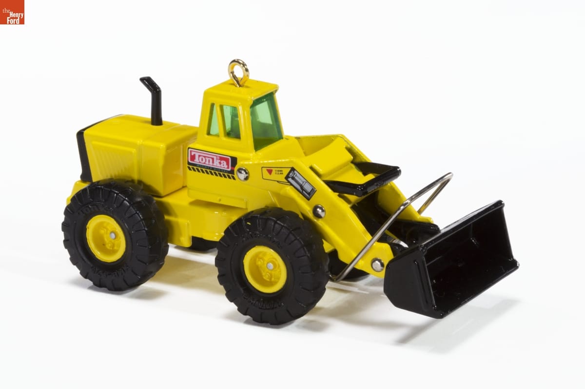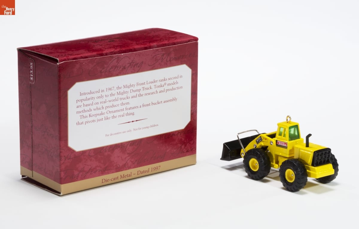 Introduced in 1967, the Mighty Front Loader ranks second in / popularity only to the Mighty Dump Truck. Tonka(R) models / are based on real-world trucks and the research and production / methods which produce them. / This Keepsake Ornament features a front bucket assembly / that pivots just like the real thing. / For decorative use only. Not for young children / Die-case Metal - Dated 1997